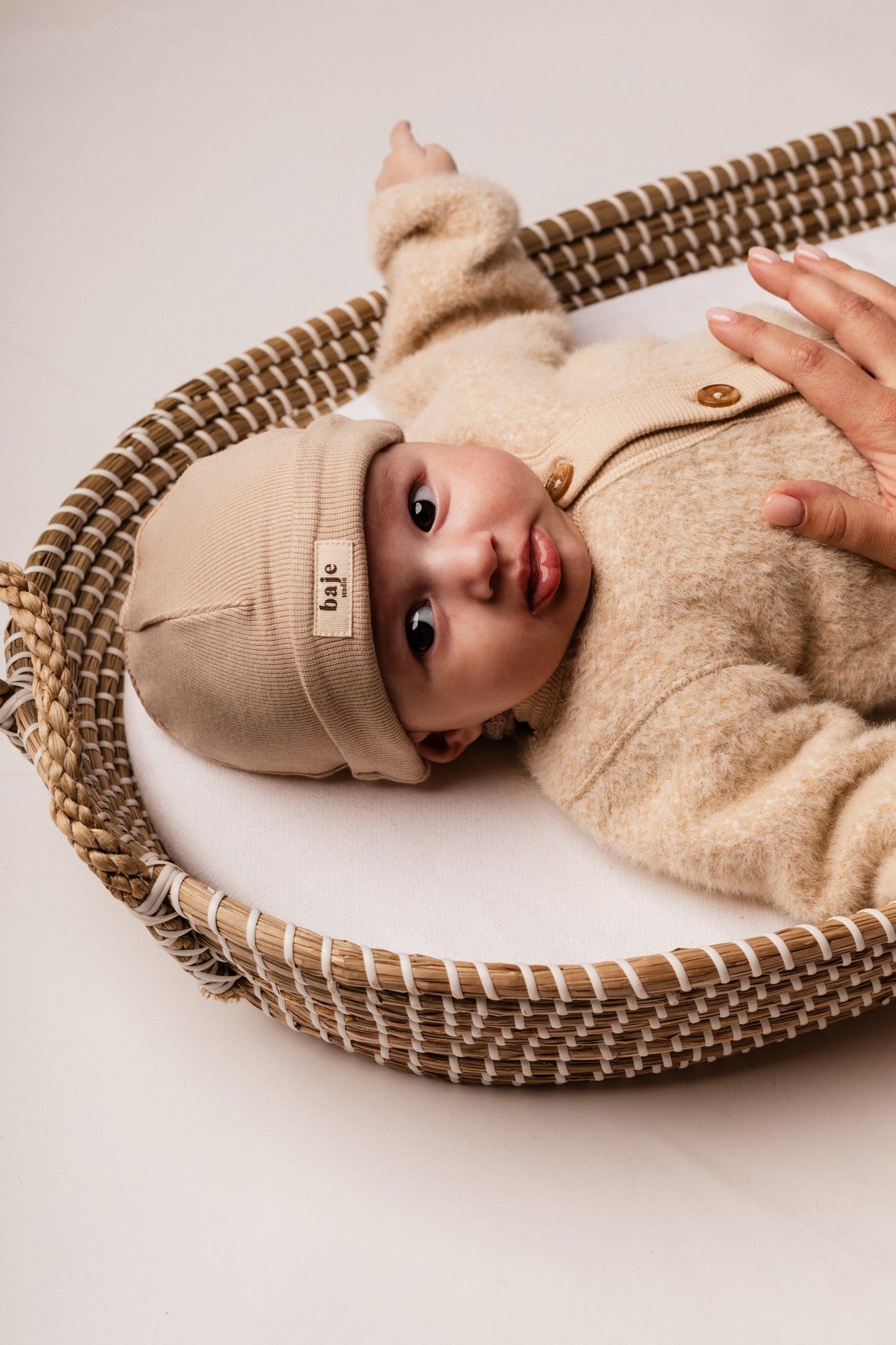 Het baby mutsje Vich van Baje Studio is speciaal ontworpen voor de allerkleinsten. Gemaakt van een zachte co-modal rib kwaliteit die super stretchy is en heerlijk comfortabel aanvoelt op het kwetsbare babyhoofdje. Voorop staat het Baje label, dat dit mutsje een moderne en herkenbare uitstraling geeft. De warme beige tint maakt dit mutsje ideaal voor een eerste pakje en eenvoudig te combineren met de matching legging, wrap top of romper uit de newborn collectie van Baje Studio. Zo stel je een complete en stijlvolle eerste outfit samen voor jouw kleintje.