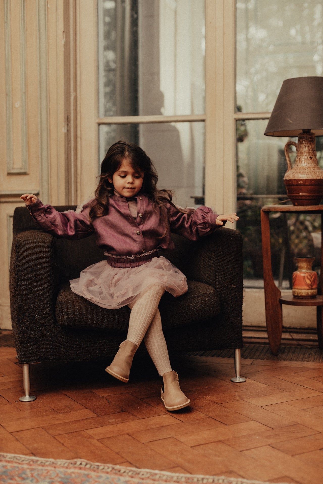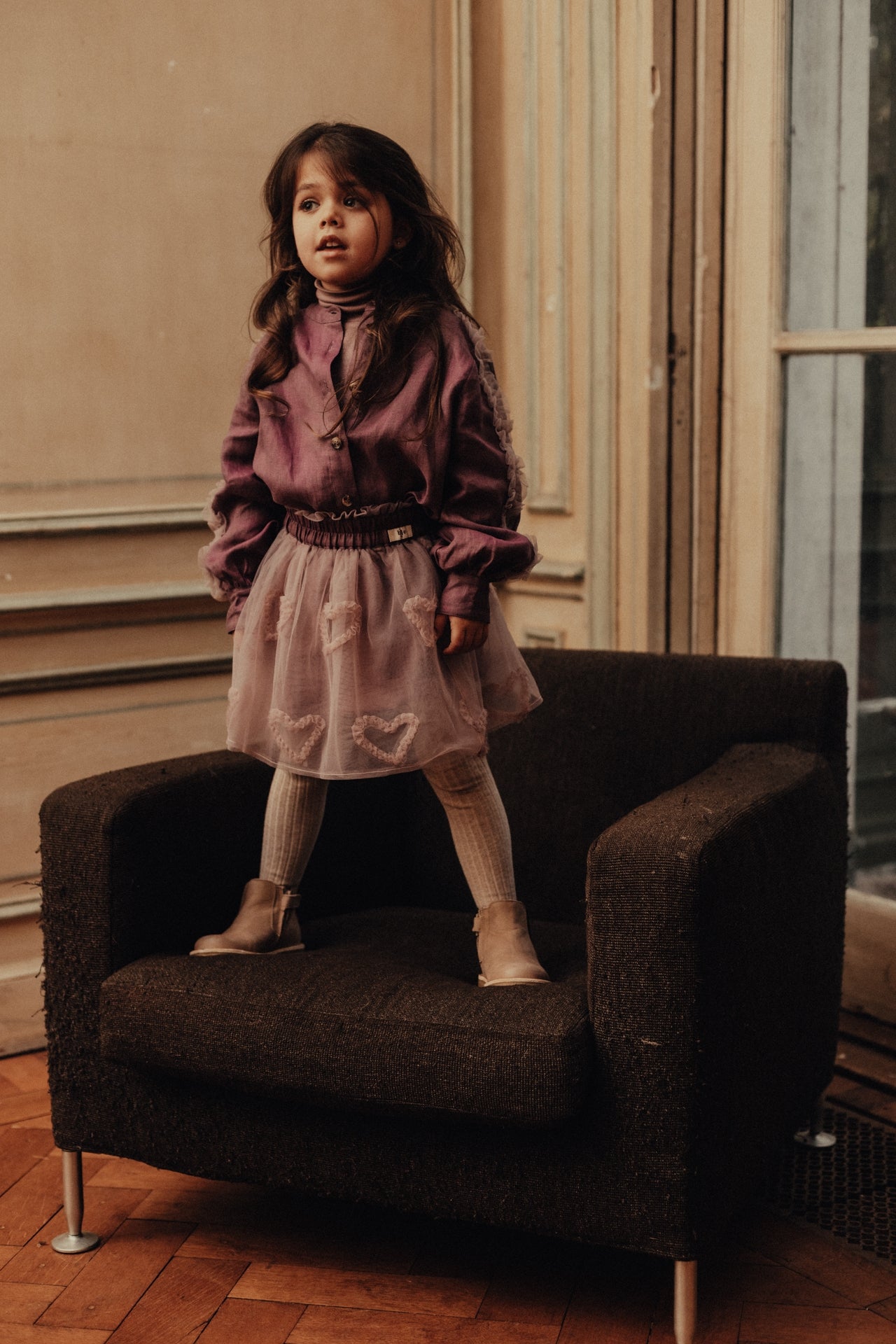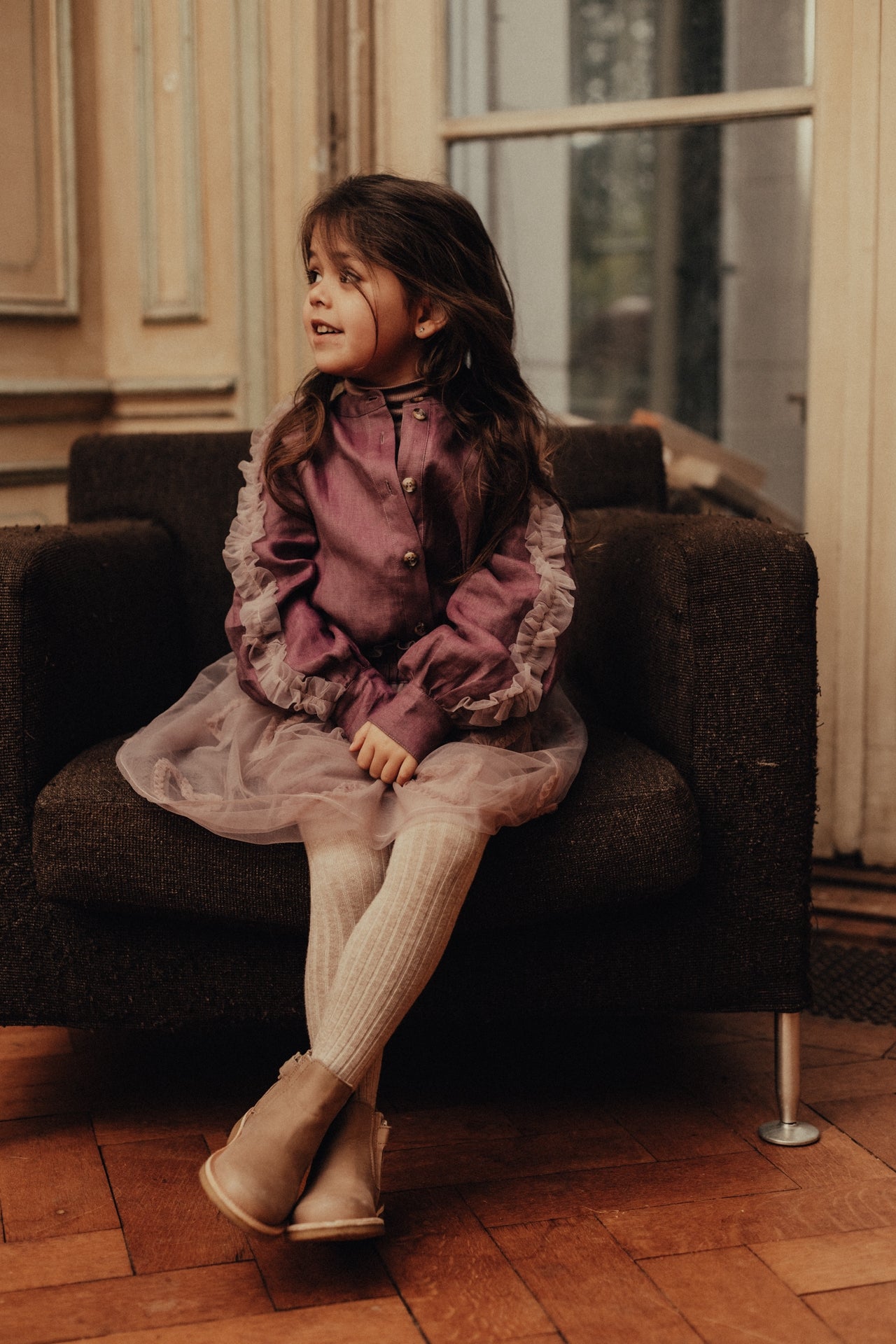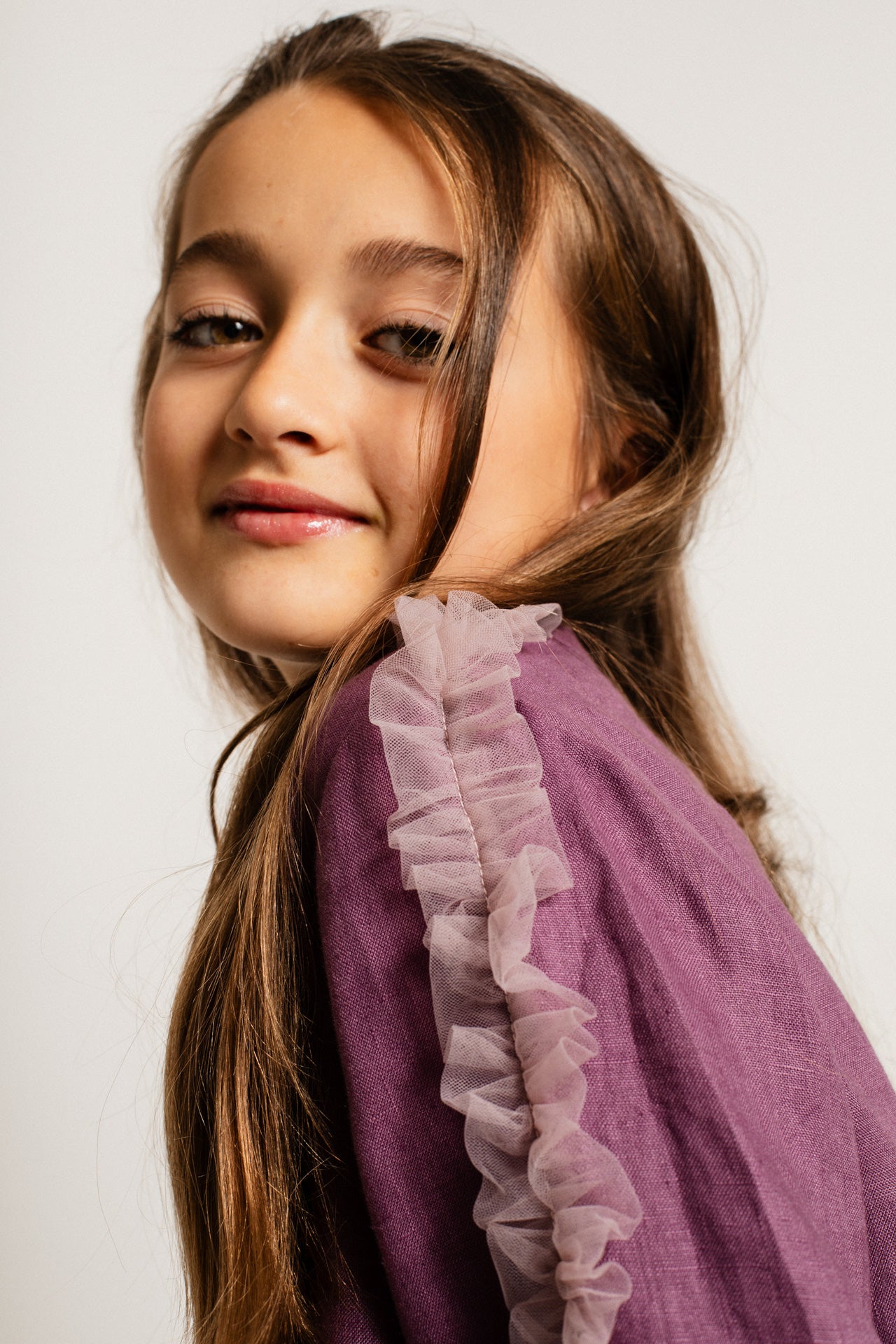 Blouse Lanzy uit de winter collectie van Baje Studio is een heerlijke meiden blouse. In een prachtige faded paarse kleur, purple plum. De blouse heeft ruches van kant over de gehele mouw.