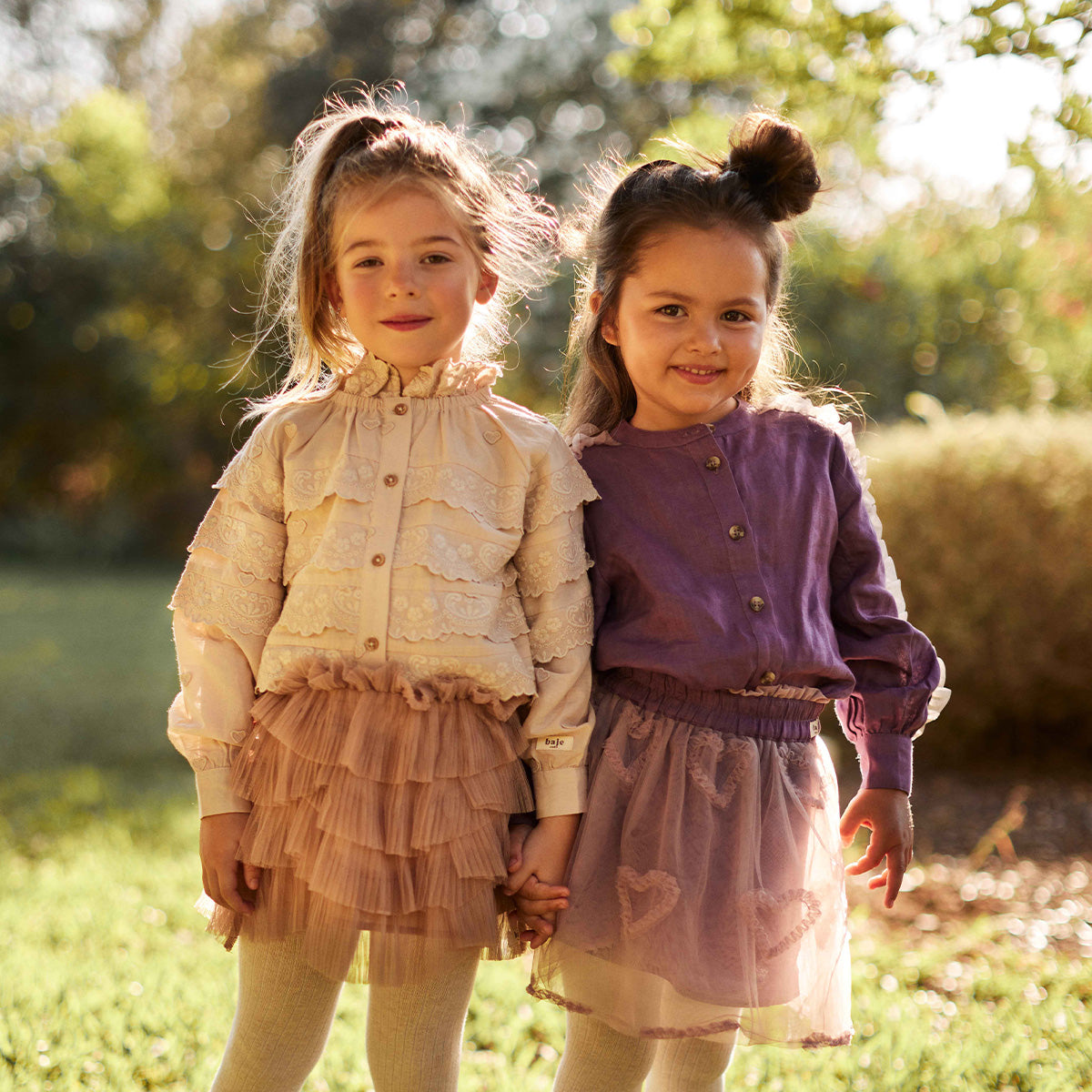 Oh wauw, deze blouse Luen van Baje Studio is echt alles wat je hebben wil deze winter voor je meisje. Prachtige details, zoals een mooi opstaande kraag en kanten ruches en embroderie hartjes.
