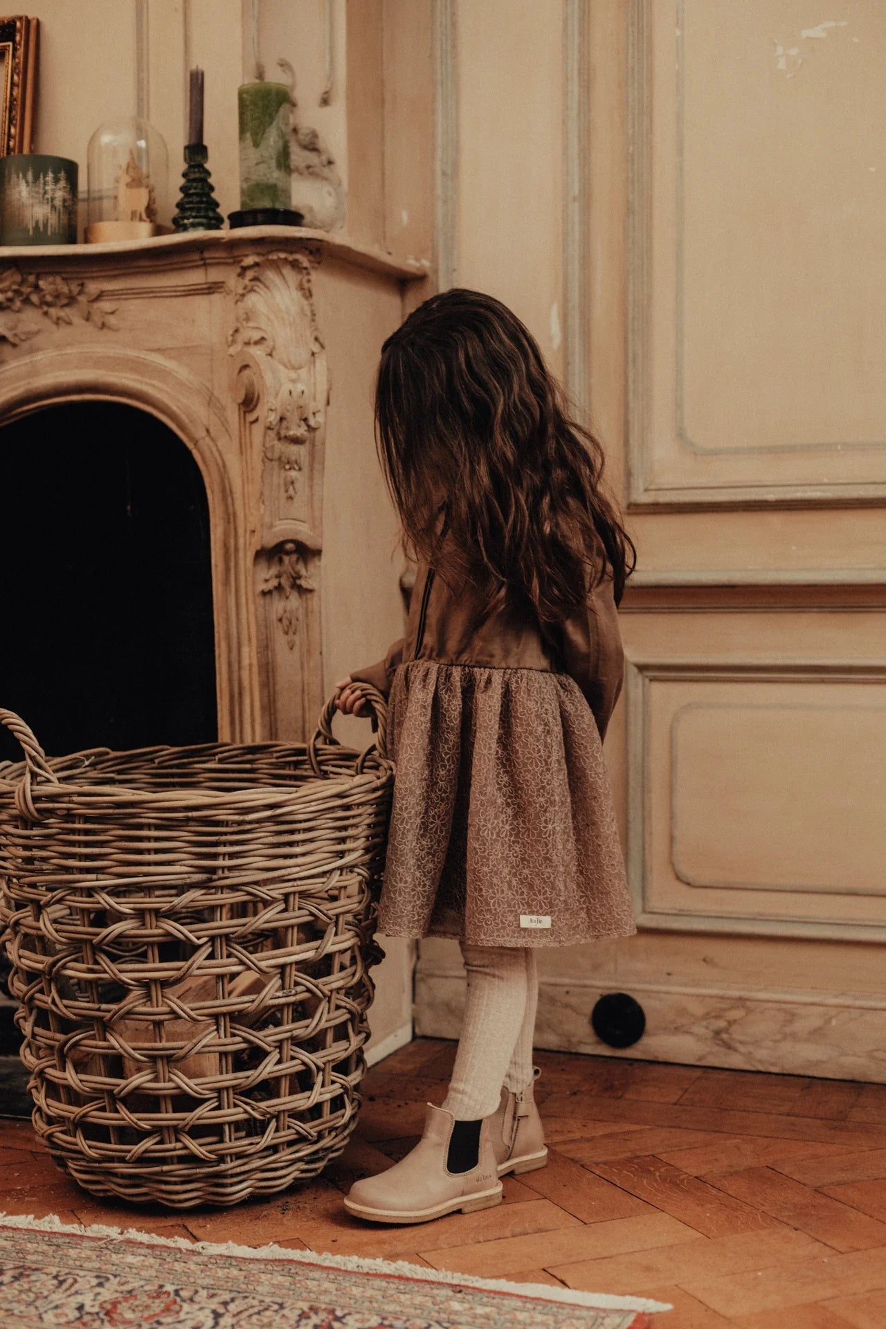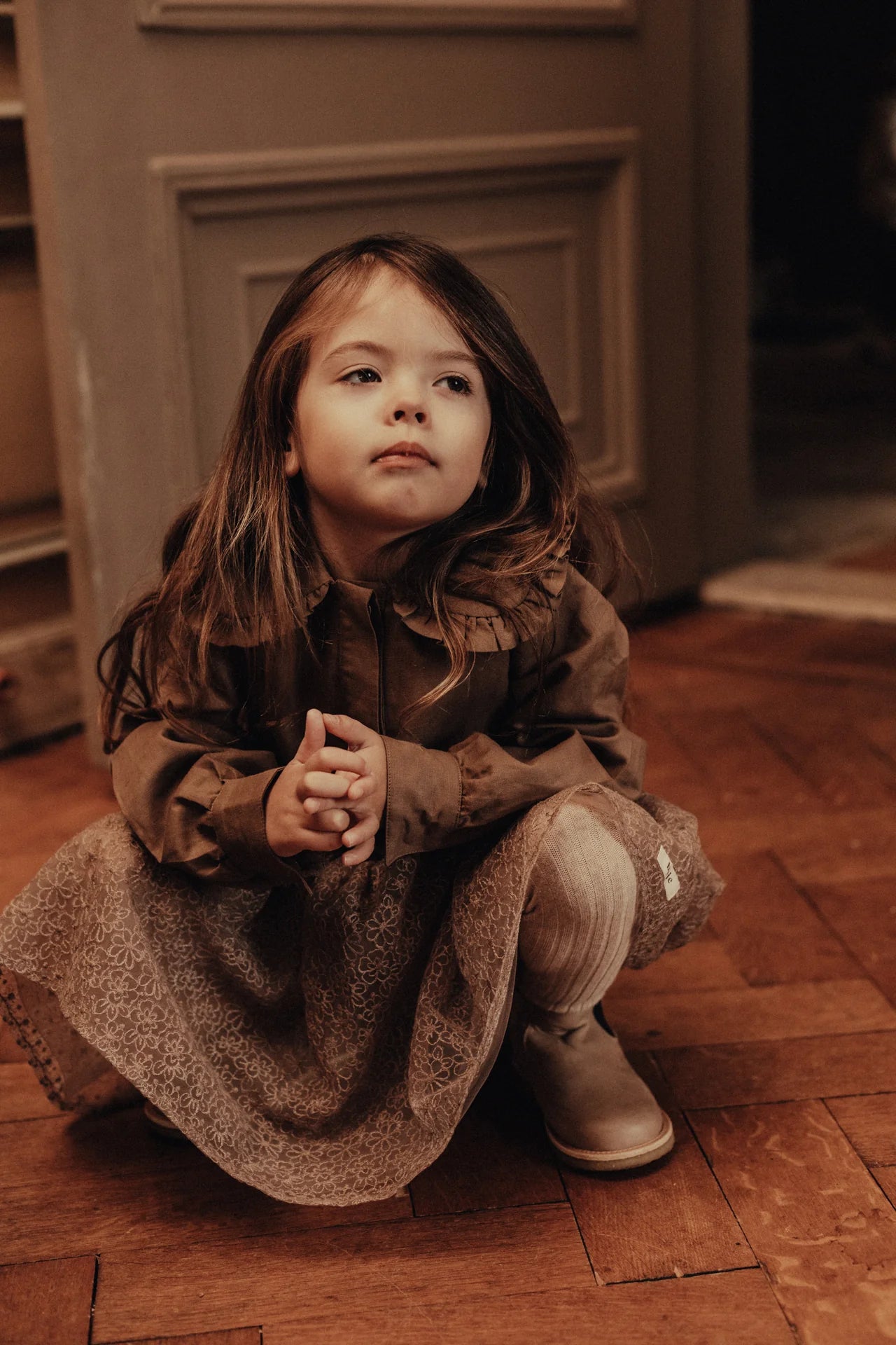 Luxe winterjurk van Baje Studio. Dress Bowil is een echte eyecatcher en uniek in zijn soort. De bruine jurk combineert een klassieke linnen bovenkant met een speelse rok van fijn geborduurd tule met bloemen. Het resultaat is een stijlvol en dromerig ontwerp dat perfect is voor speciale gelegenheden, feestjes of gewoon een bijzondere dag. Het Peter Pan-kraagje met subtiele ruffles geeft de jurk een charmante, klassieke uitstraling, terwijl de tule rok met bloemenborduursels zorgt voor een speels en elegant effect. Deze kinderjurk is dé outfit waarmee je meisje straalt!