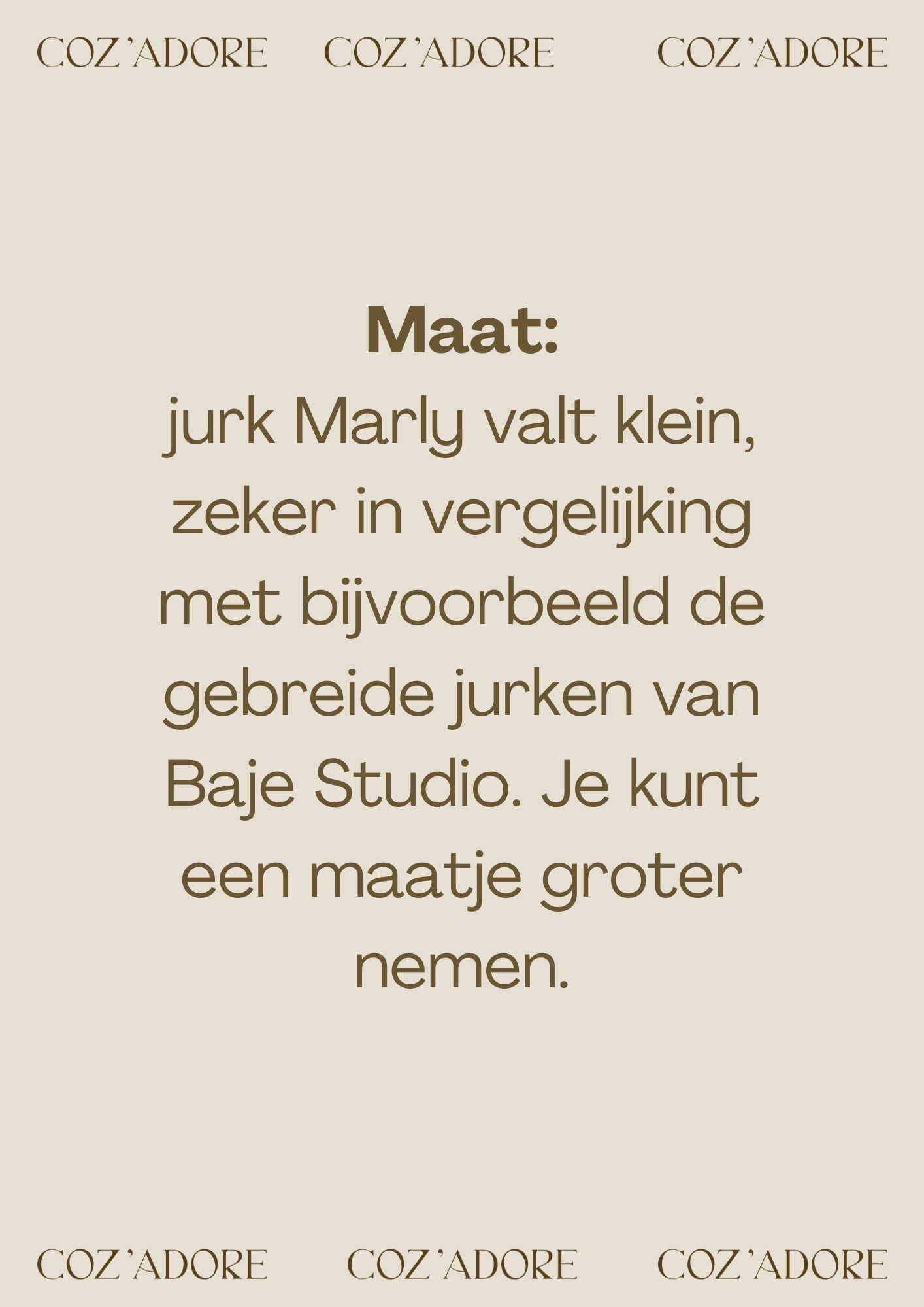 Maat advies: let op jurk Marly peach almond valt klein. Neem een maat groter dan dat je normaal gesproken van Baje Studio zou nemen. De mouwen zullen dan in verhouding wat langer zijn, maar die kan je naar binnen vouwen zodat het niet opvalt.