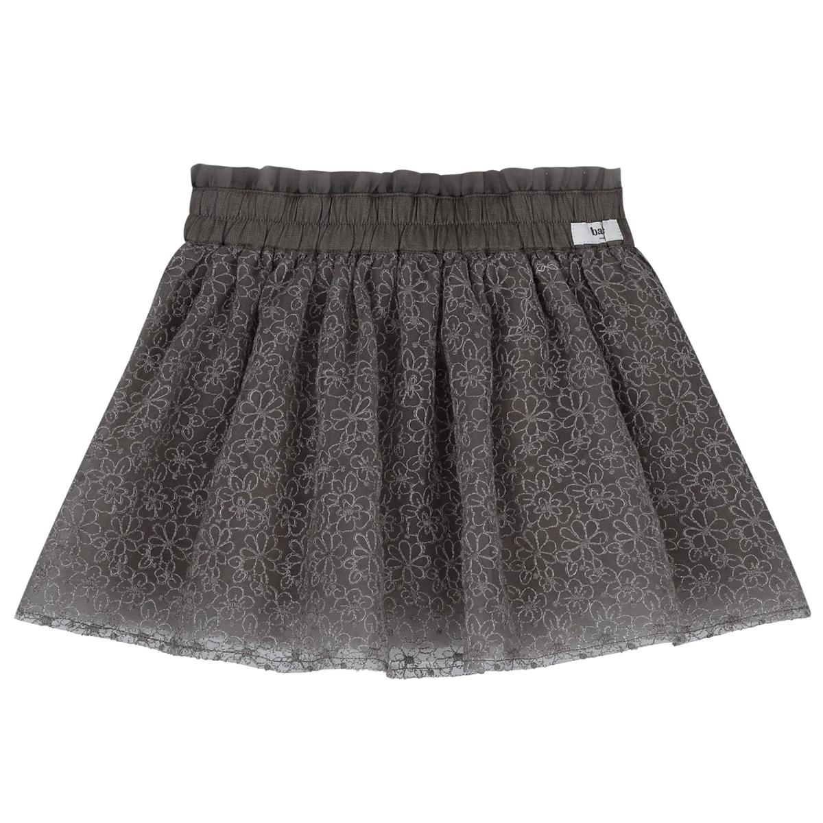 Deze betoverende meisjes rok van gebloemde tule van Baje Studio is dé favoriet van de winter collectie. De rok is gemaakt van meerdere lagen zachte tule, afgewerkt met speelse bloemen-details, wat zorgt voor een unieke en romantische uitstraling. Dankzij de elastische tailleband is de rok niet alleen feestelijk, maar ook comfortabel en makkelijk te dragen.