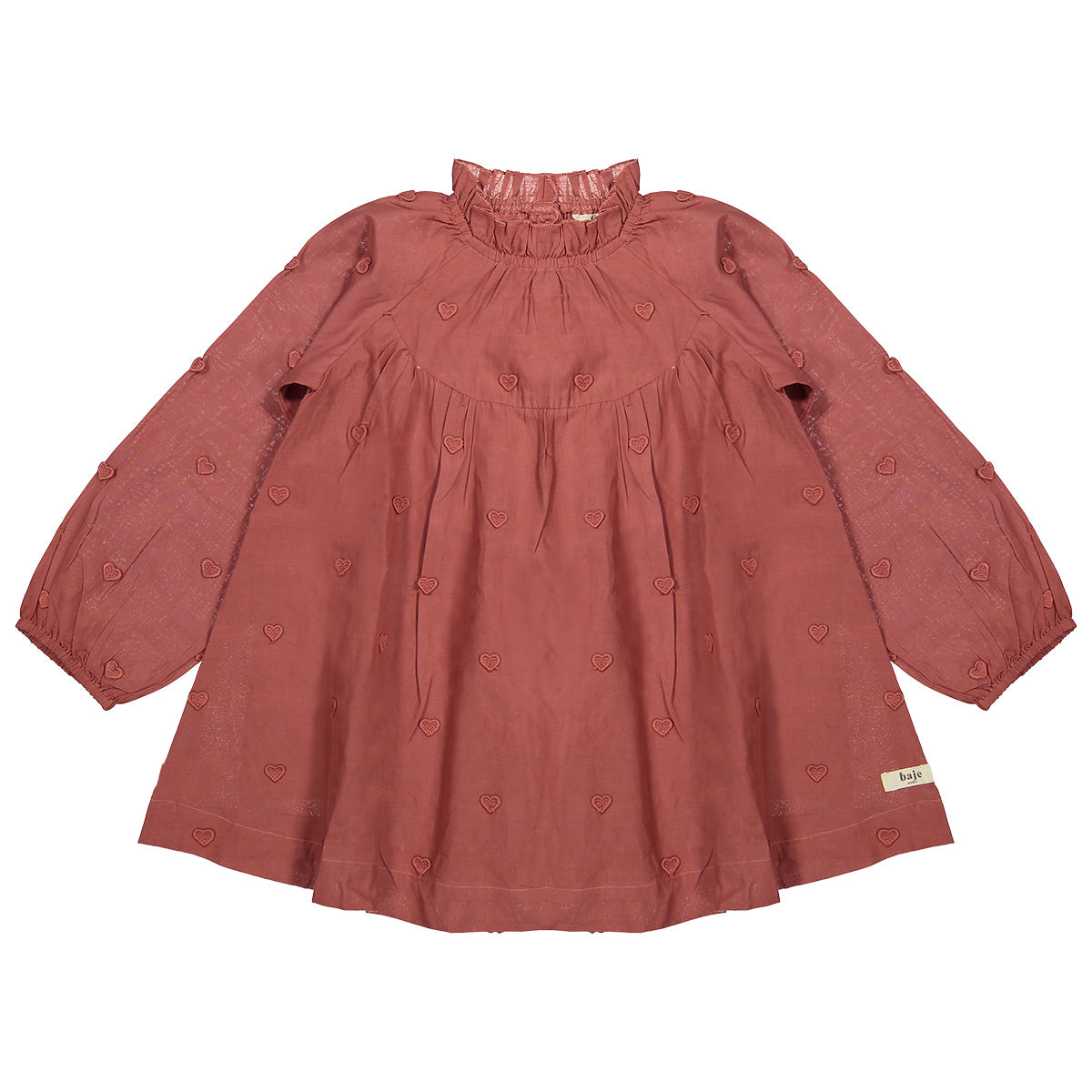 Prachtige jurk voor de herfst, maar ook heel leuk voor Valentijn bijvoorbeeld. Dress Lajoux van Baje Studio is een A-lijn jurk met een embroidery hartjes patroon. De jurk heeft kort model
