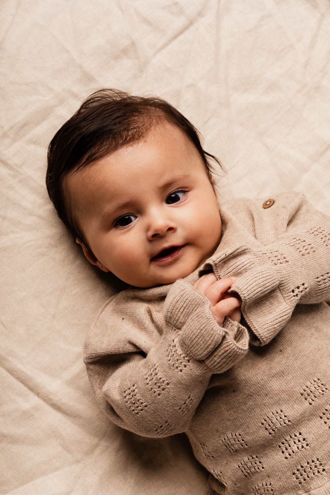 Een super schattig gebreid truitje voor baby meisjes. Knitted sweater Livres van Baje Studio is echt een plaatje. Schattige ruches bij de mouwen en ook aan de onderkant van de baby trui. De zandkleurige trui heeft een opengewerkt breisel aan de onderkant en twee knoopjes bij de linker schouder.