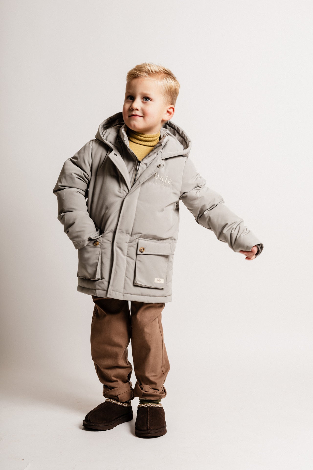 Maat: Winterjas Logan grijs van Baje Studio valt vrij klein! Neem bij twijfel een maatje groter.