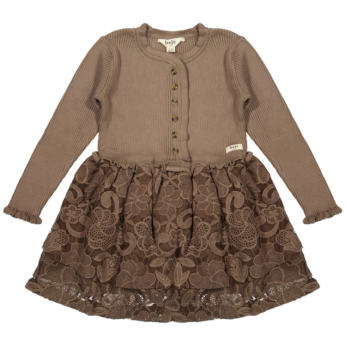 Prachtige winter jurk van Baje Studio. Dress Marieze is een absolute eyecatcher. Deze warme winterfavoriet combineert elegantie en comfort. Het bovenstuk is gemaakt van zachte rib-knit stof die heerlijk warm en stretchy is, terwijl de volle rok is uitgevoerd in rijkelijk geborduurde tule voor een romantische uitstraling. Dankzij de knoopsluiting aan de voorkant en de verfijnde afwerking is dit jurkje zowel praktisch als stijlvol. De Marieze jurk is verkrijgbaar in donkerbruin en peach, beide tijdloze tinten die naadloos aansluiten bij de wintercollectie en eindeloos te combineren zijn. Of je nu kiest voor de stoere uitstraling van donkerbruin of de zachte elegantie van peach, deze jurk maakt van elke gelegenheid een feestje.