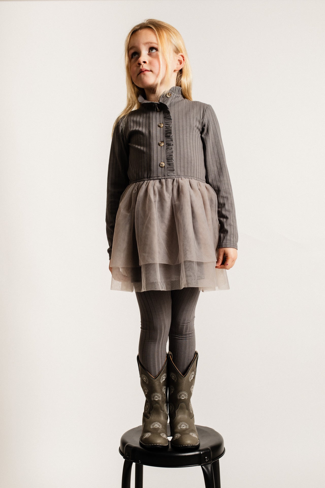 Deze donkergrijze rib legging Molly van Baje Studio is een echte essential voor meisjes die comfort en stijl willen combineren. De legging heeft een strakke pasvorm en lange pijpen, waardoor hij niet alleen warm en zacht zit, maar ook makkelijk te combineren is met verschillende outfits. Draag hem casual met een voor een trendy look, of stijl hem onder een jurkje voor een speels en girly effect. De fijne ribstructuur geeft de legging een elegante uitstraling, terwijl de elastische tailleband zorgt voor extra draagcomfort en bewegingsvrijheid.