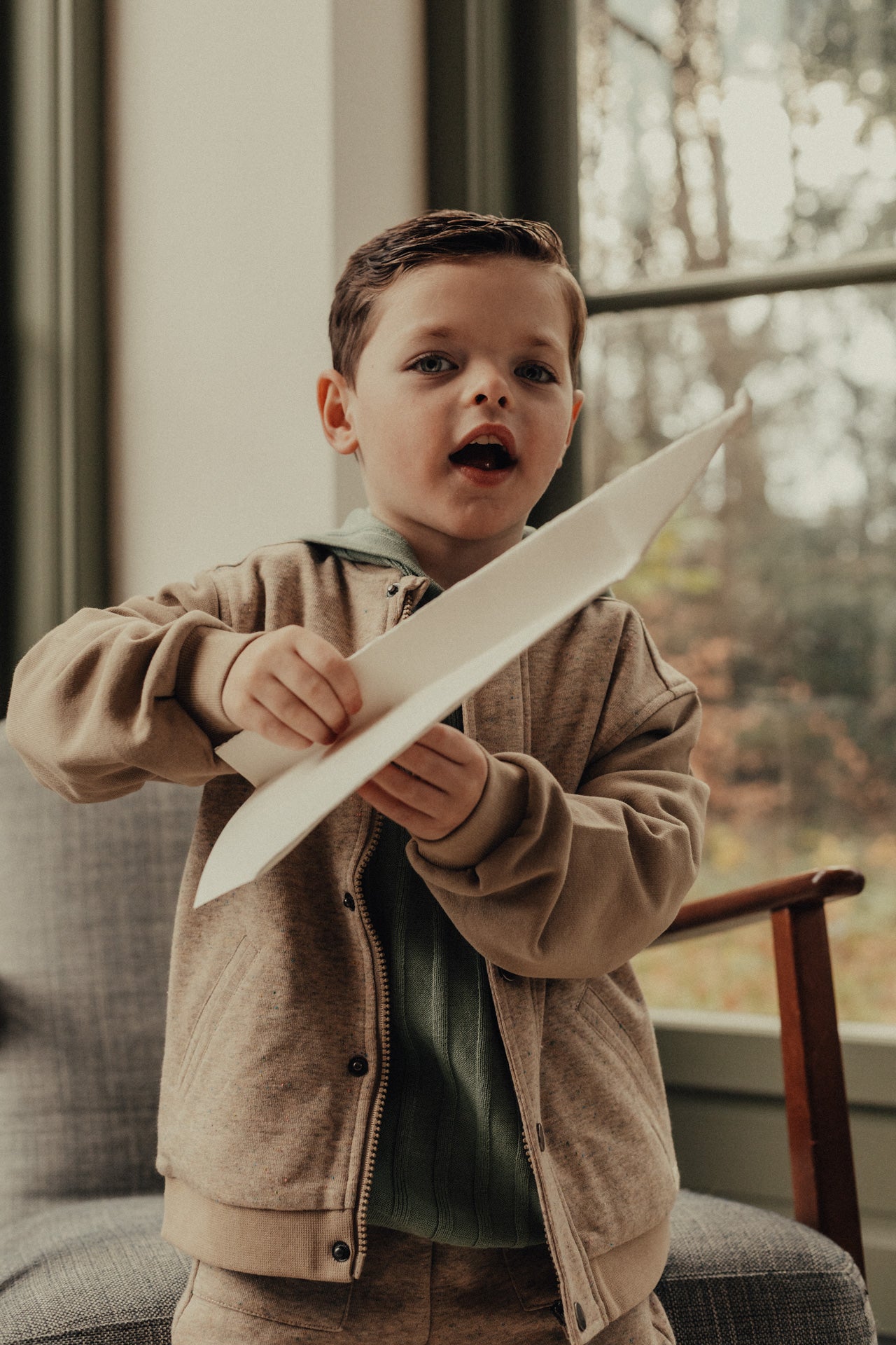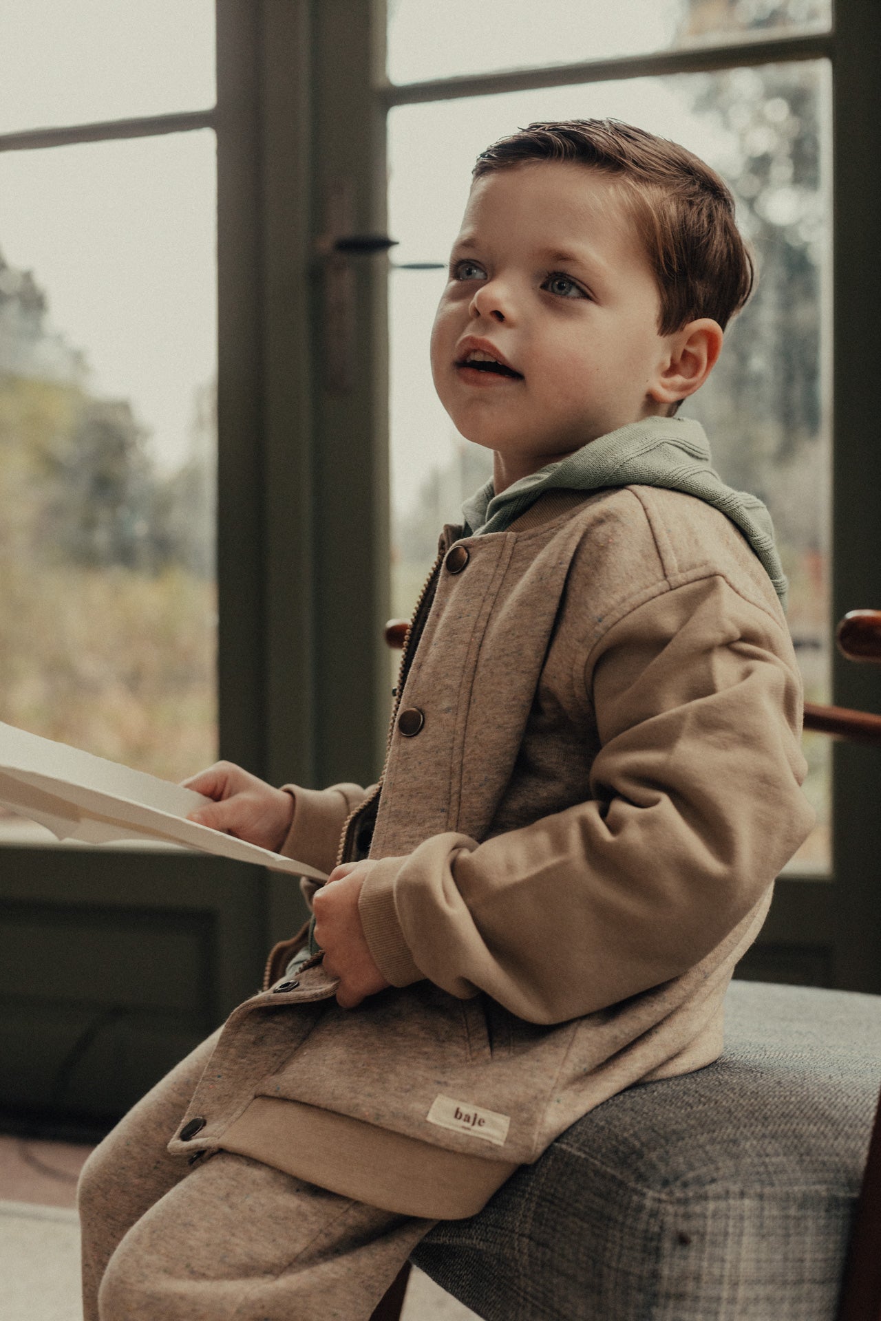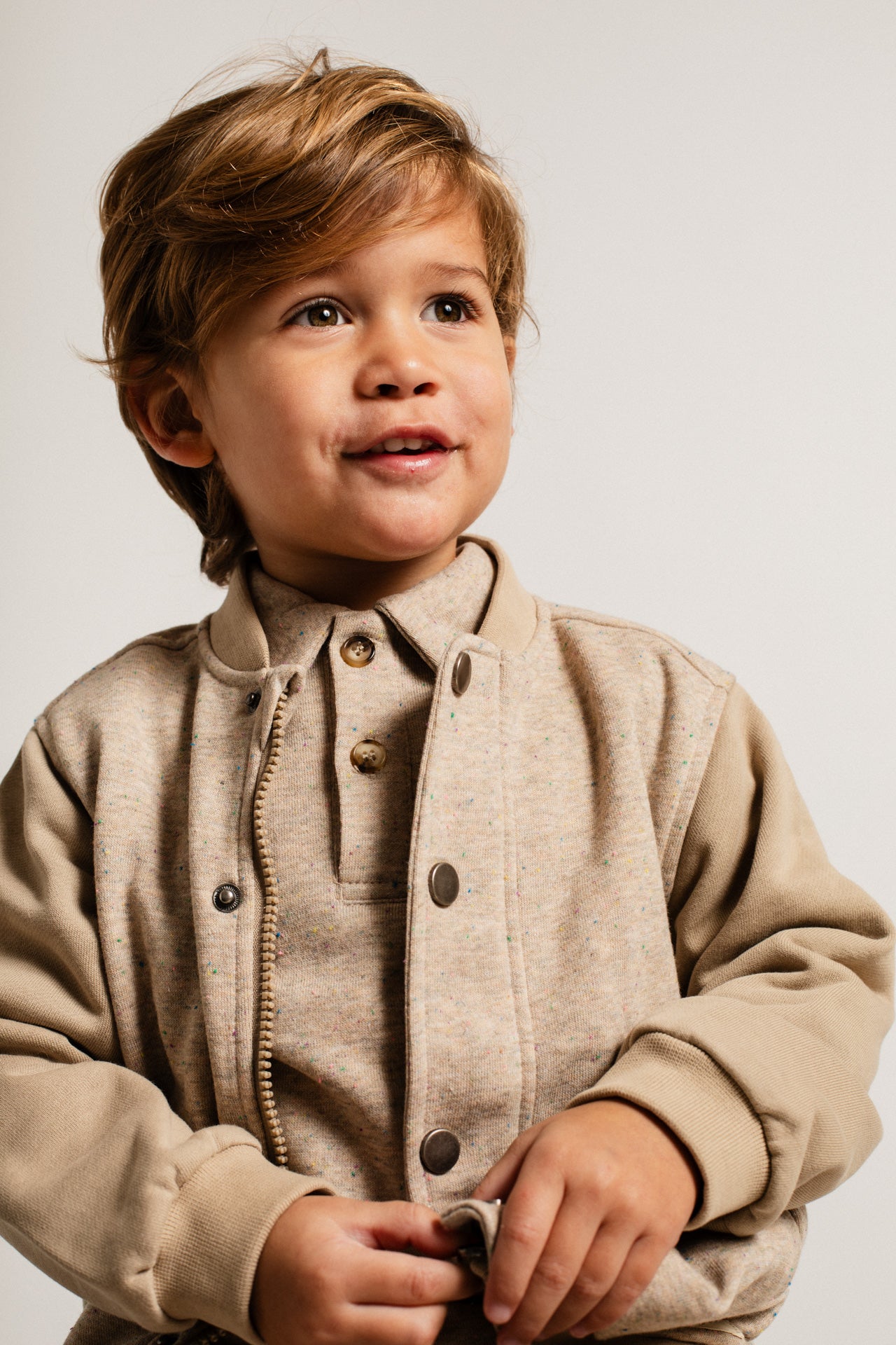 Stoer tussenjasje van Baje Studio. Jacket Morrens heeft een zand gemeleerde body en een zandkleurige mouwen en boorden. Dit bomberjack voor kinderen sluit met drukknopen.