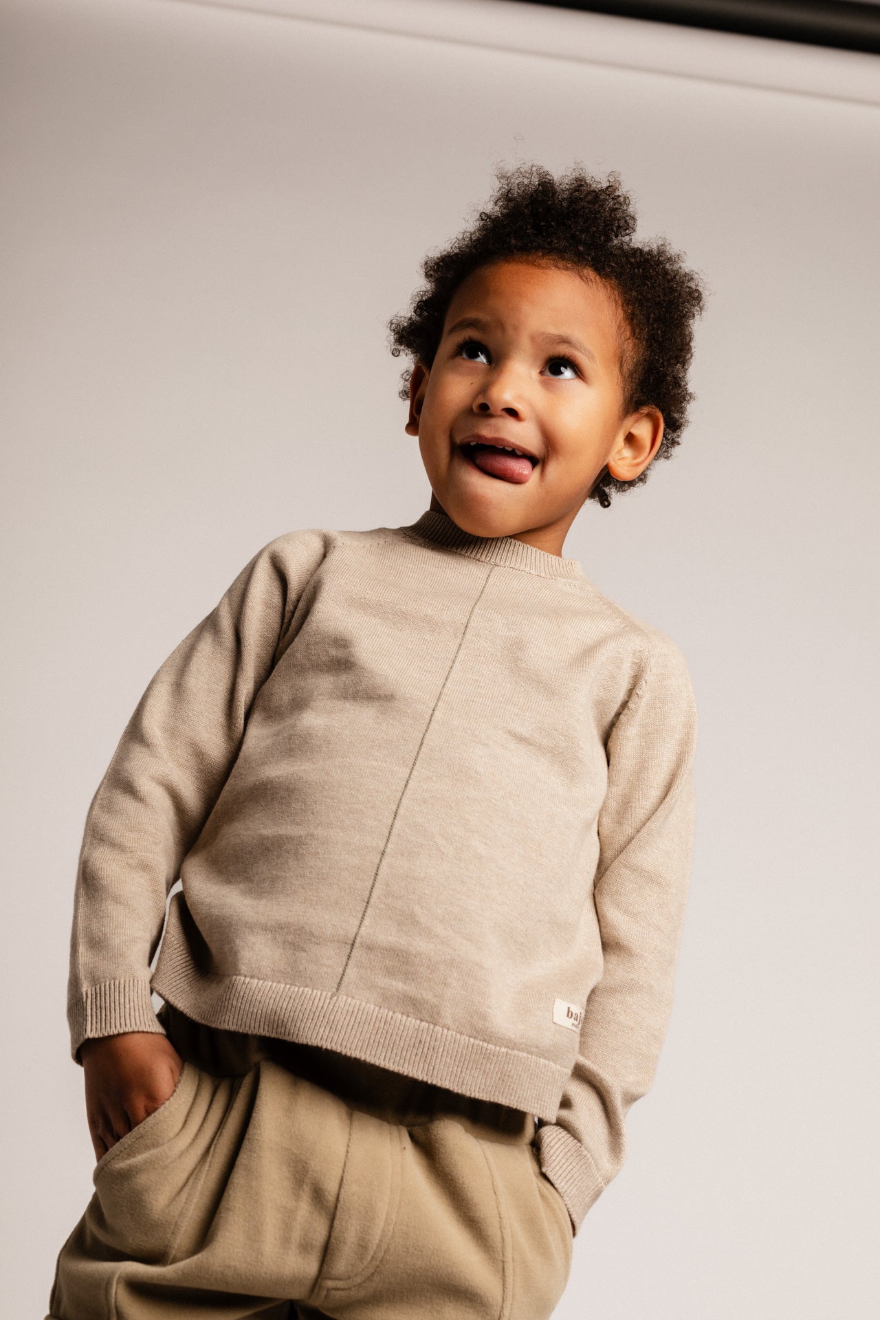 Sweater Orbe van Baje Studio. Een stoere jongenstrui in de kleur sand desert, dit is een warm beige tint.