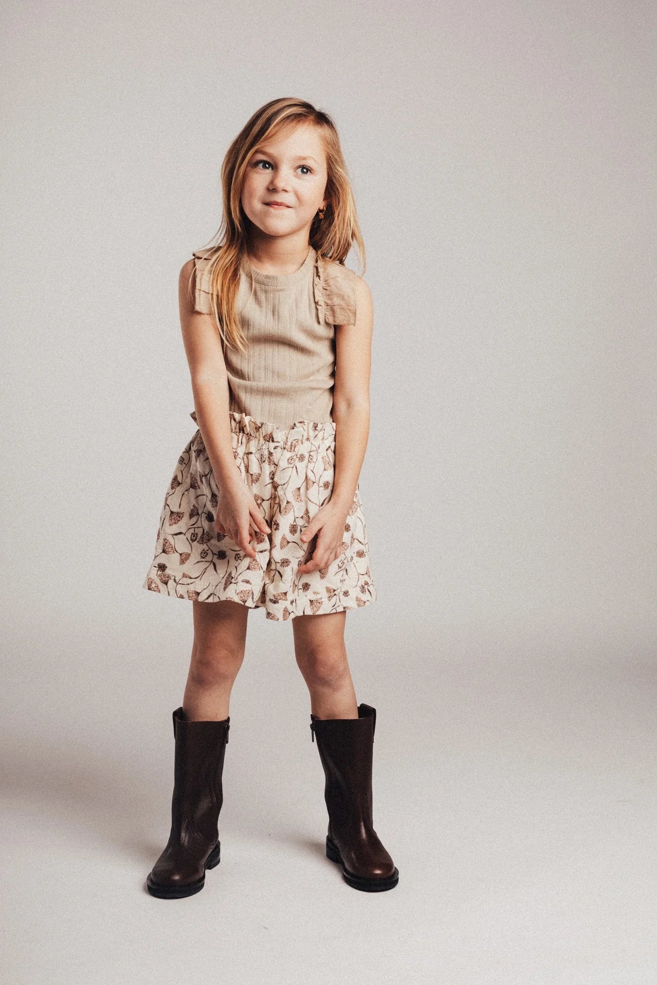 Vrolijk aop print bloemen short. Basiskleur van het short is crème oat. Deze shorts combineer je leuk met een top in roze of mauve tinten. Beige of zandkleurige bovenstukken zijn ook mogelijk.
