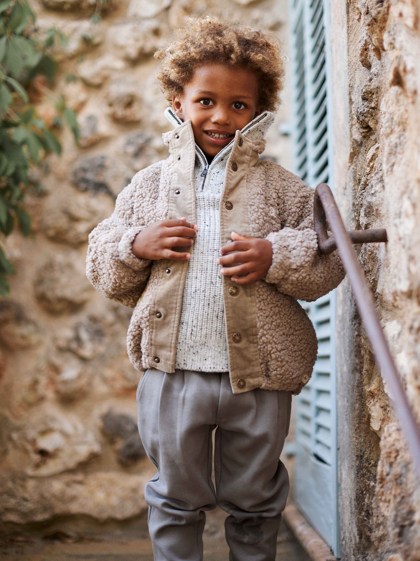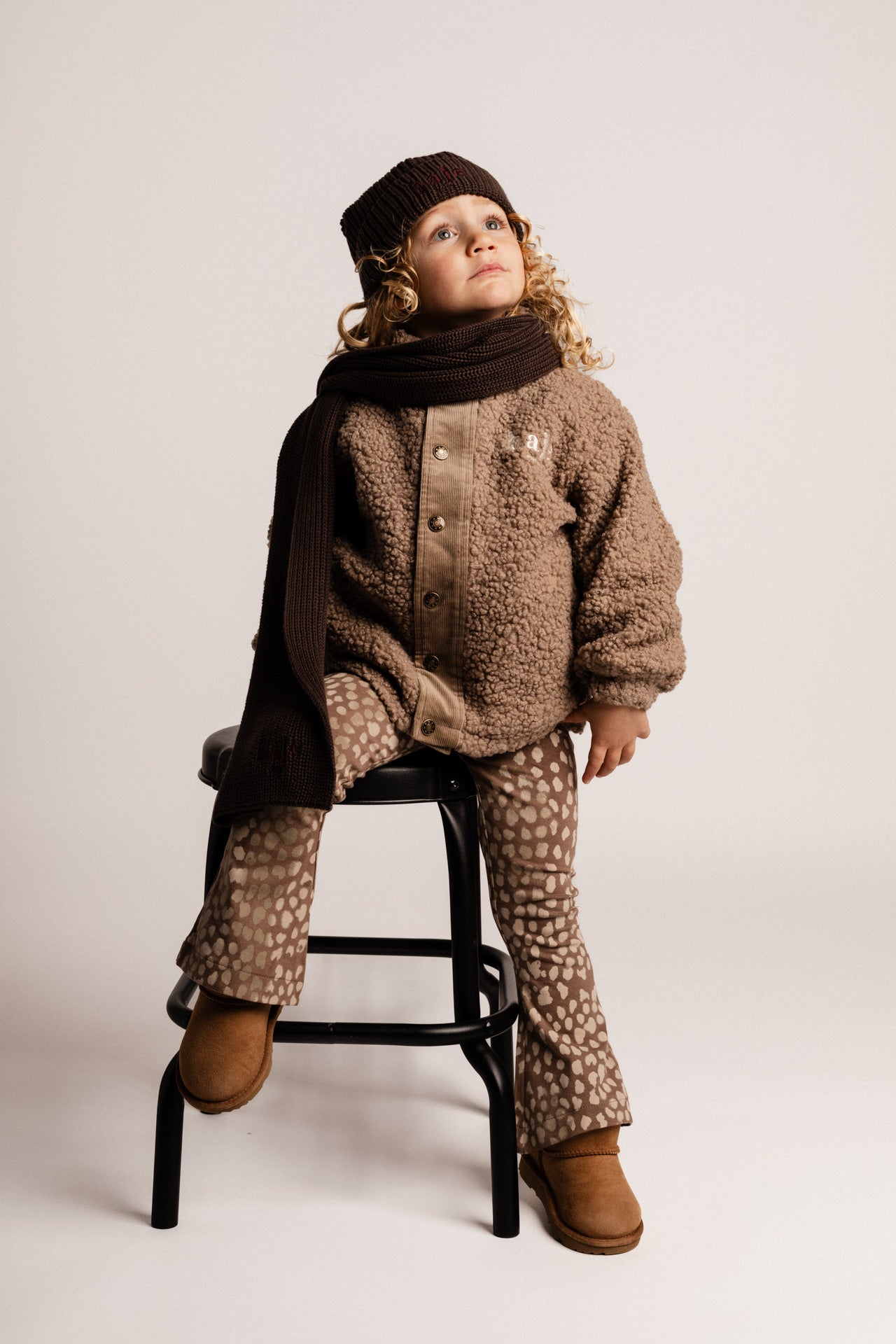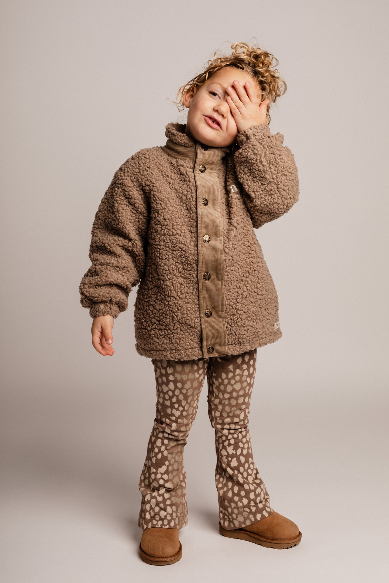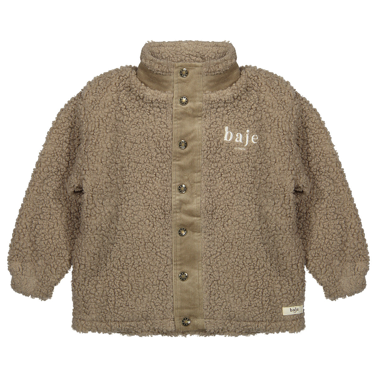 Bruin teddy jasje van Baje Studio. Teddy jack Rances is gemaakt van zachte teddy stof met corduroy details in het midden en bij de hals. Het jasje heeft een wat groter Baje logo. Deze teddy jas kan door zowel jongen als meisje gedragen worden.
