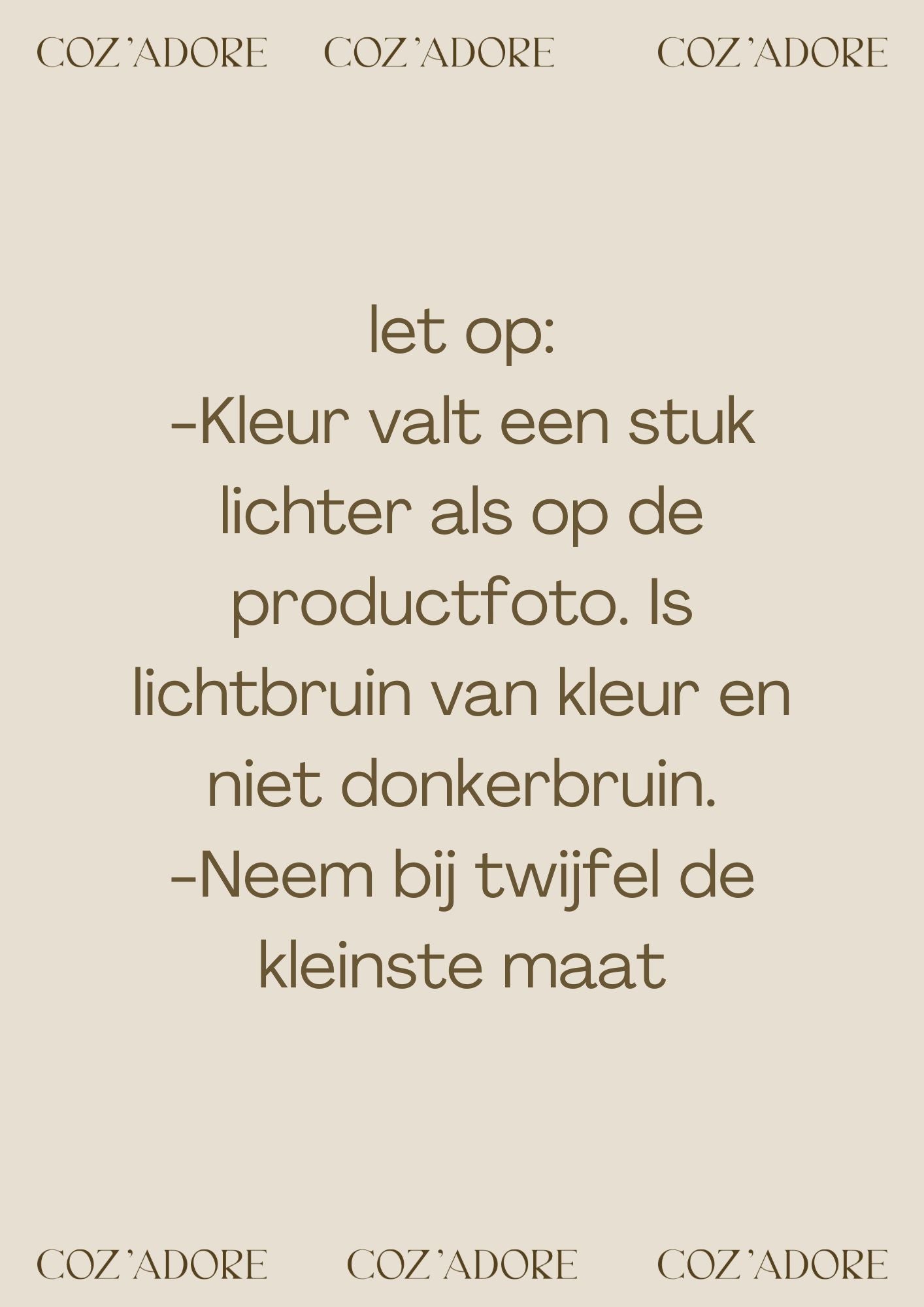 Let op: de kleur brown cacao is een stuk lichter als op de productfoto. Het colletje is meer lichtbruin in tegenstelling tot het donkerbruin van de foto. De kleur op de laatste sfeerfoto komt het meest overeen.