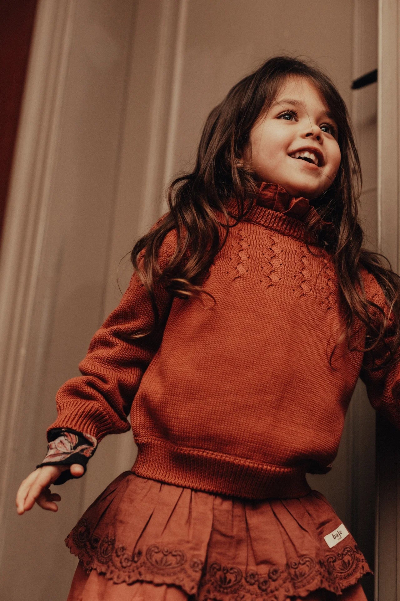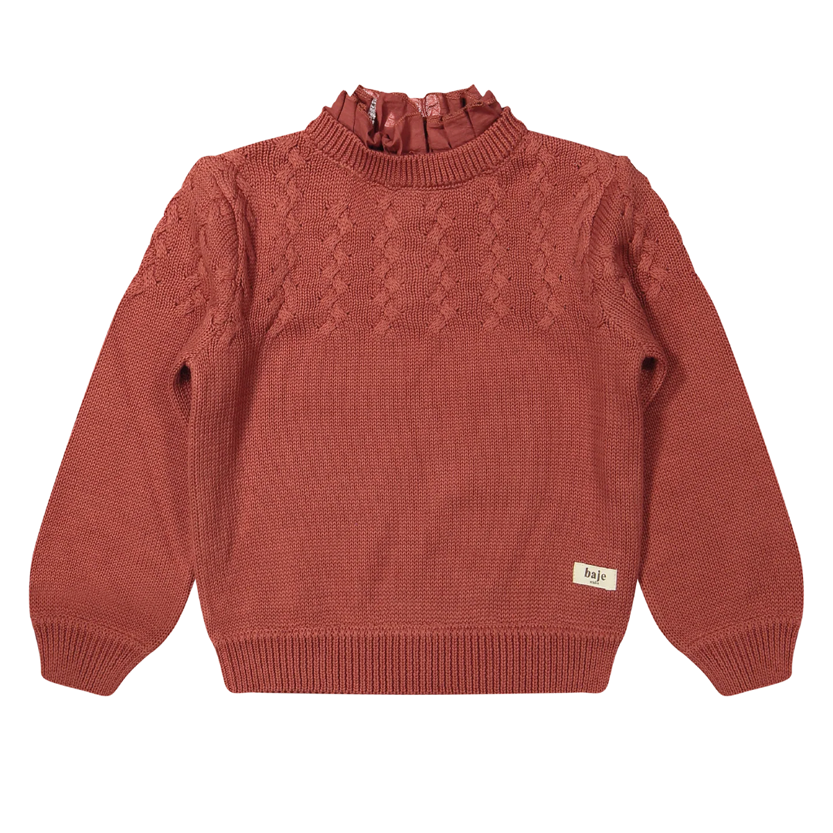 Deze elegante meiden trui is een echte eyecatcher voor het najaar. Sweater Vallon van Baje Studio is gemaakt van een zachte katoenmix. De kindertrui heeft een speels gebreid patroon op het bovenstuk. De ruffle kraag in een lichtere rode kleur geeft een romantische en speelse uitstraling. Aan de achterkant sluit de trui met knopen.