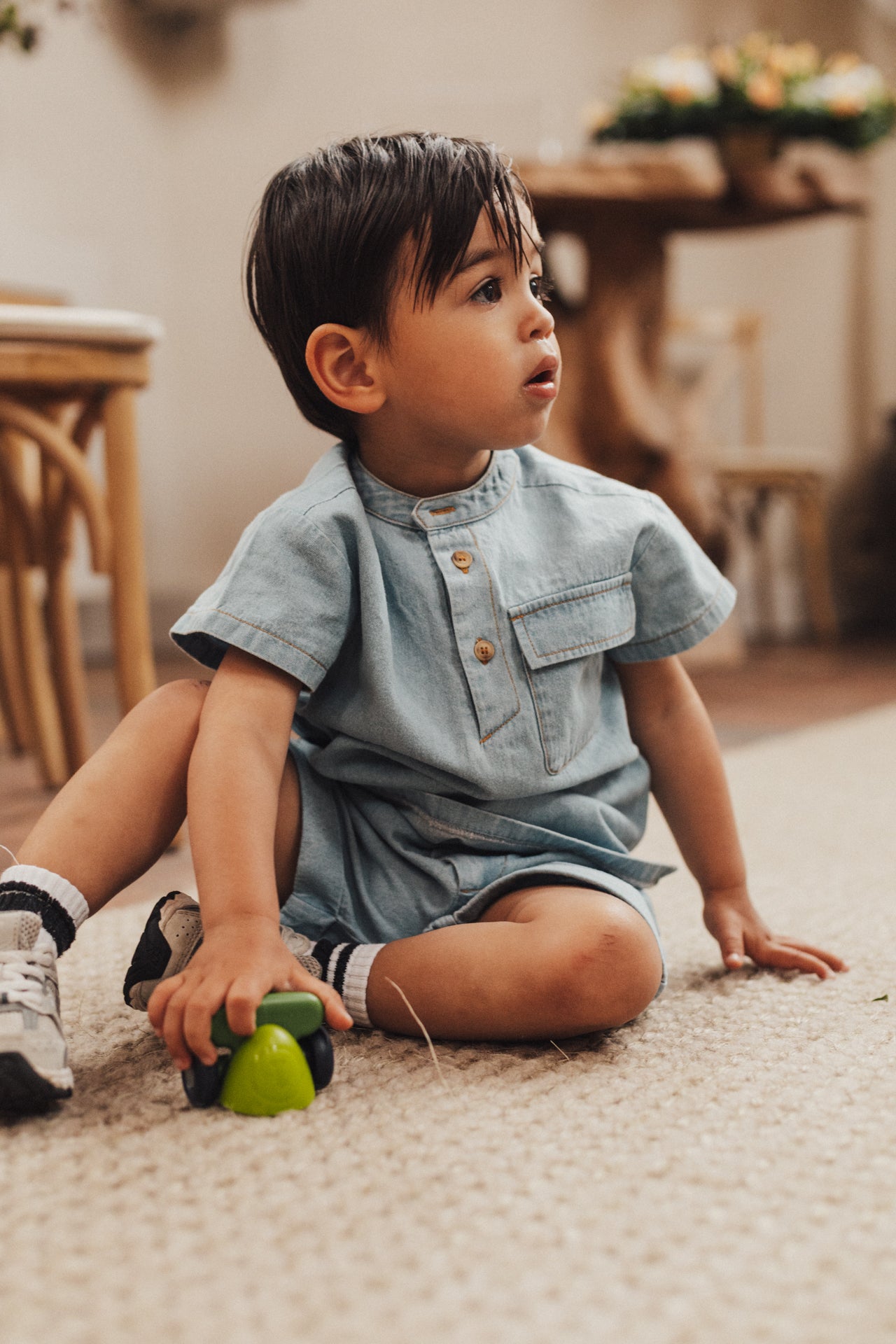 Lichtblauwe denim blouse met korte mouwen voor jongens. De blouse van spijkerstof heeft een mandarijn kraag en een borstzakje. Stoer en tegelijkertijd casual item voor jouw jongen.