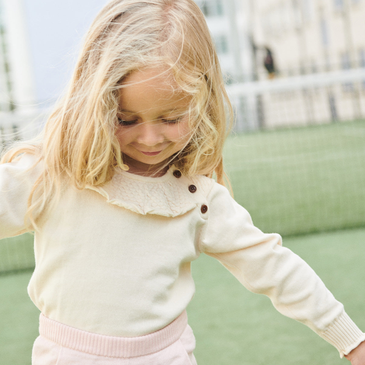Laat je betoveren door de elegant gebreide truitje van Copenhagen Colors, een waar symbool van verfijning. De trui heeft een tijdloze crème kleur. De charmante kraag, gevormd als een madeliefje, voegt een subtiele gratie toe aan het ontwerp. De drie duurzame corozo knopen en de delicate ruches op de manchetten zorgen voor verfijnde details, waardoor deze blouse een tijdloze elegantie uitstraalt. Deze schattige top voor meisjes is dun gebreid. In de echte winter heb je waarschijnlijk een laagje met lange mouwen eronder nodig. Voor het voor en najaar is margueritte blouse cream prima zo te dragen.