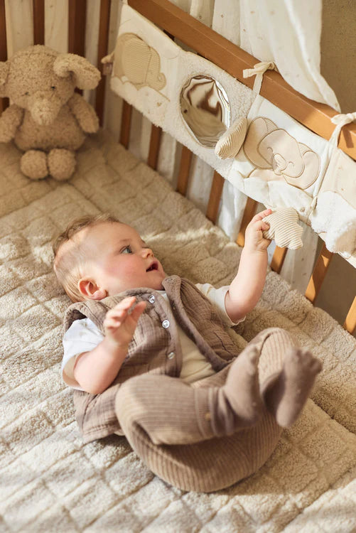 Deze Activiteiten Boxhanger is een schattig 5-delige slinger vol olifanten van Jollein. Het boekje bevat schattige olifantjes en een spiegeltje die je kleintje uren zullen vermaken. Het boekje maakt geluidjes en bevat knisperingen en touwtjes, waardoor de zintuigen van je baby gestimuleerd worden. Perfect voor in de box!