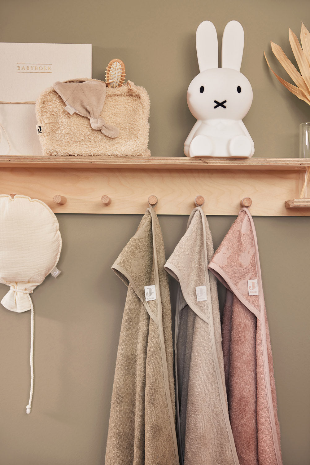 Super leuke badcape met subtiele Nijntje touch. Na het badderen of zwemmen is deze badcape ideaal. Je wikkelt je baby direct warm in zodra hij/zij uit het water komt. Met de capuchon bedek je het hoofd waardoor je kindje daar ook geen warmte verliest. Comfortabel voor je baby! De zachte badstof is mild voor de tere babyhuid en neemt goed vocht op waardoor het afdrogen in een mum van tijd klaar is. Na gebruik hang je de cape gemakkelijk op aan het lusje. De badcape is effen van kleur en in de badstof is Nijntje ingeweven. Verkrijgbaar in de kleuren olive green, nougat en wild rose.