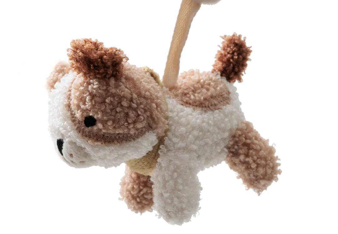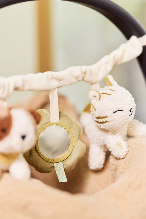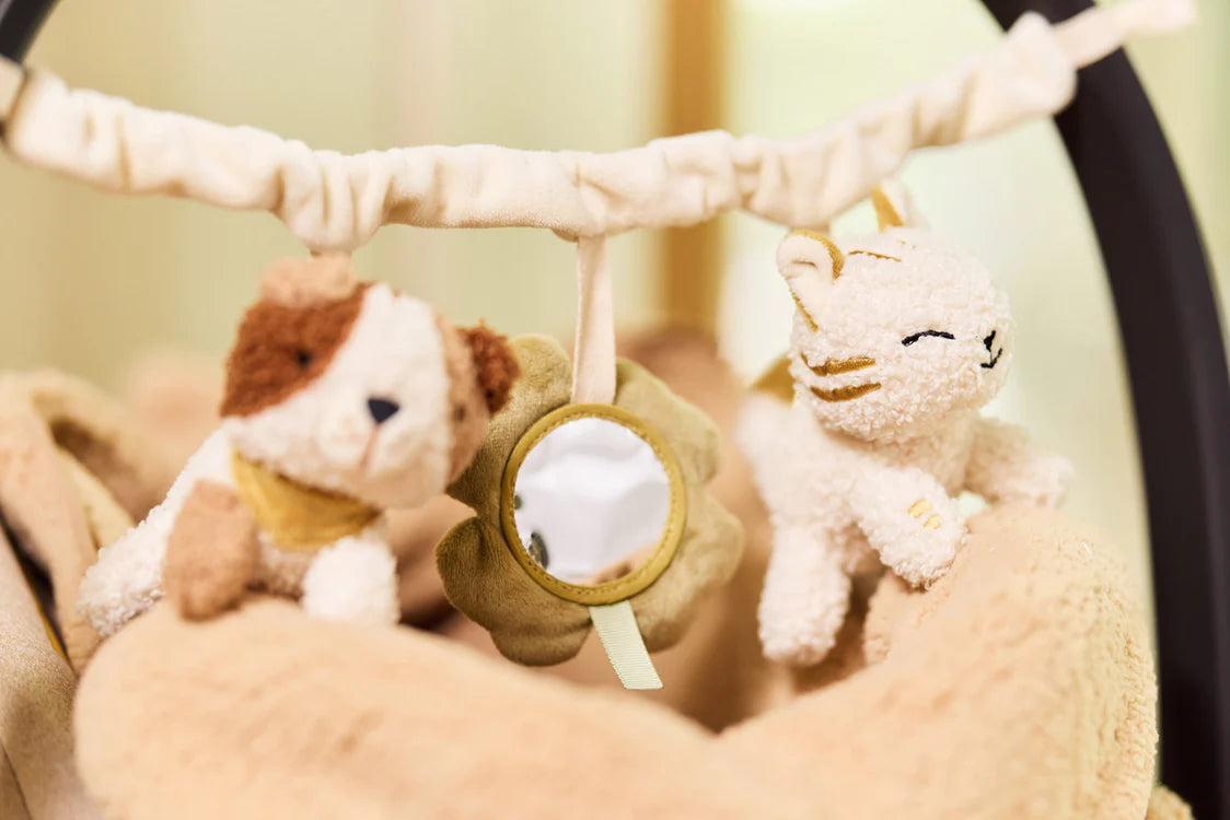Deze schattige wagenspanner Tiny Park is het perfecte speeltje voor onderweg. De wagenspanner komt uit de Tiny Park collectie van Jollein. Het ontwerp bevat een schattig hondje, een katje en een klavertje vier. Het klavertje bevat een klein spiegeltje voor extra vermaak. Een baby kijkt namelijk heel graag naar zichzelf. De wagenspanner maakt een rustgevend geluid door de belletjes die erin zitten. Een heerlijke manier om je kleintje onderweg te vermaken!
