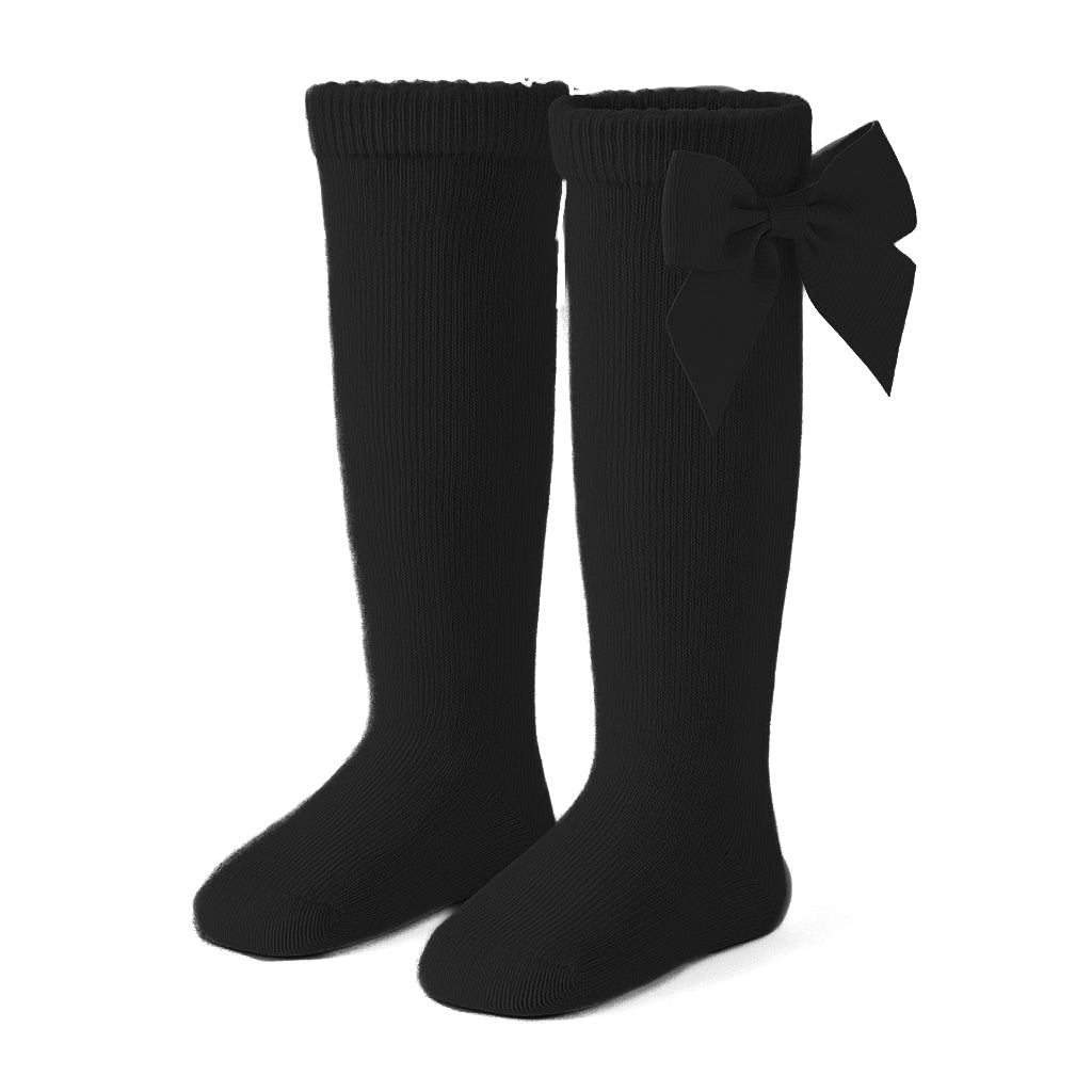 Zwarte kinderkniekousen met een strikje. De stof is effen zwart en de bovenkant van de kniekous is gekarteld. Deze kniekousen voor kinderen heeft een schattig strikje in dezelfde kleur als de kniekous zelf.