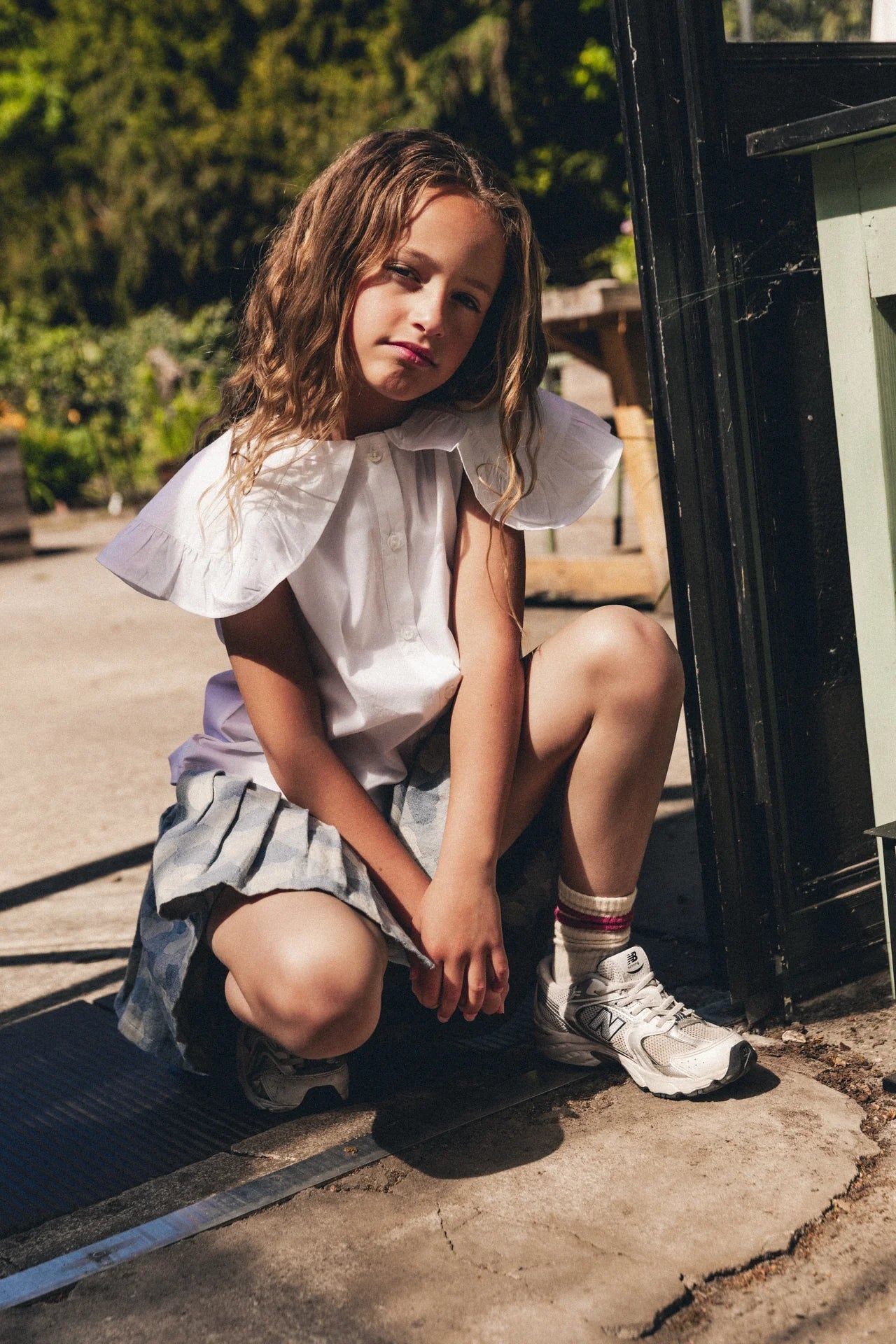 Witte zomer blouse voor meiden. Blouse Libel van Labo de Colores is mouwloos, maar heeft een grote kraag die over de schouders heen valt en een soort kapmouwtje wordt.