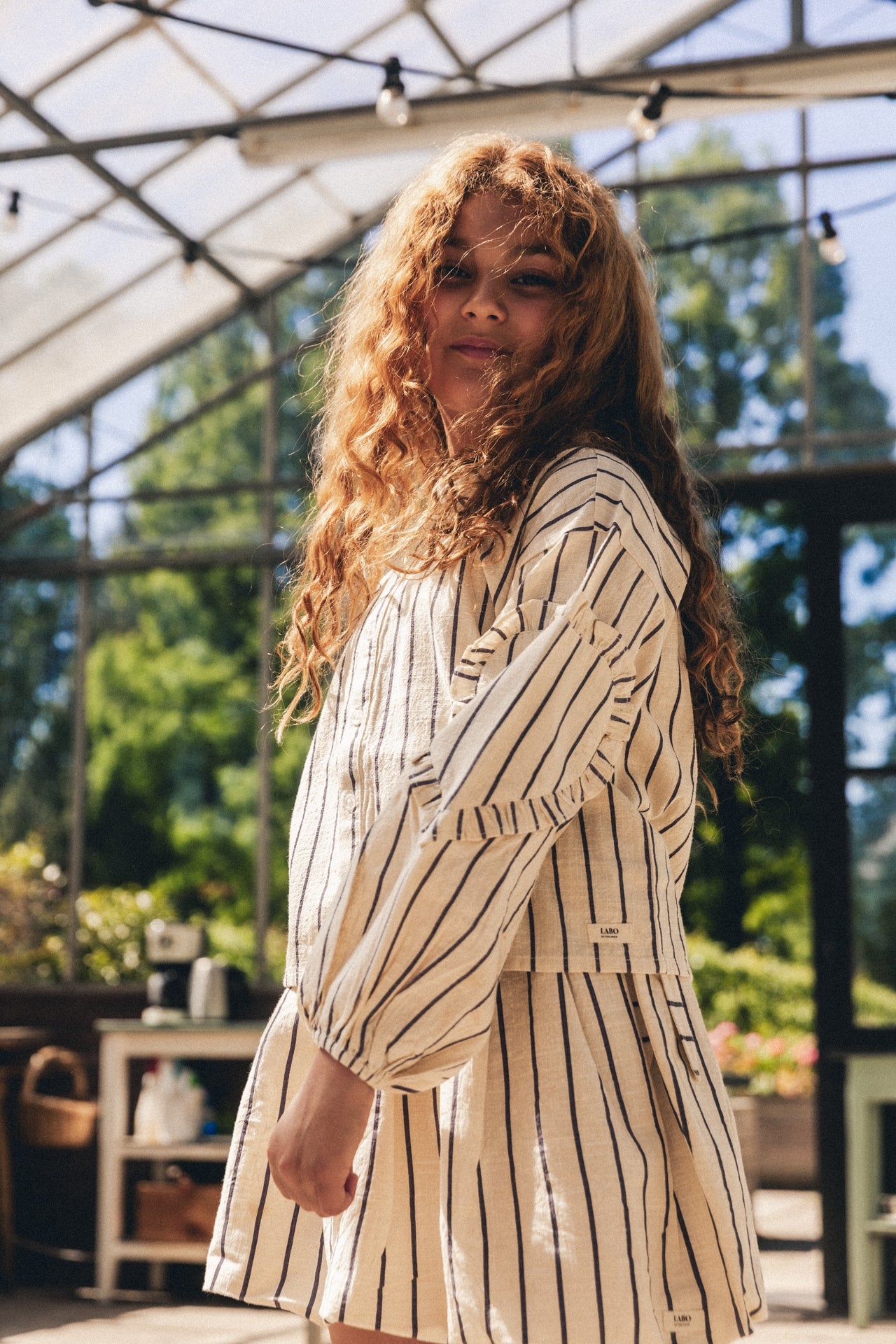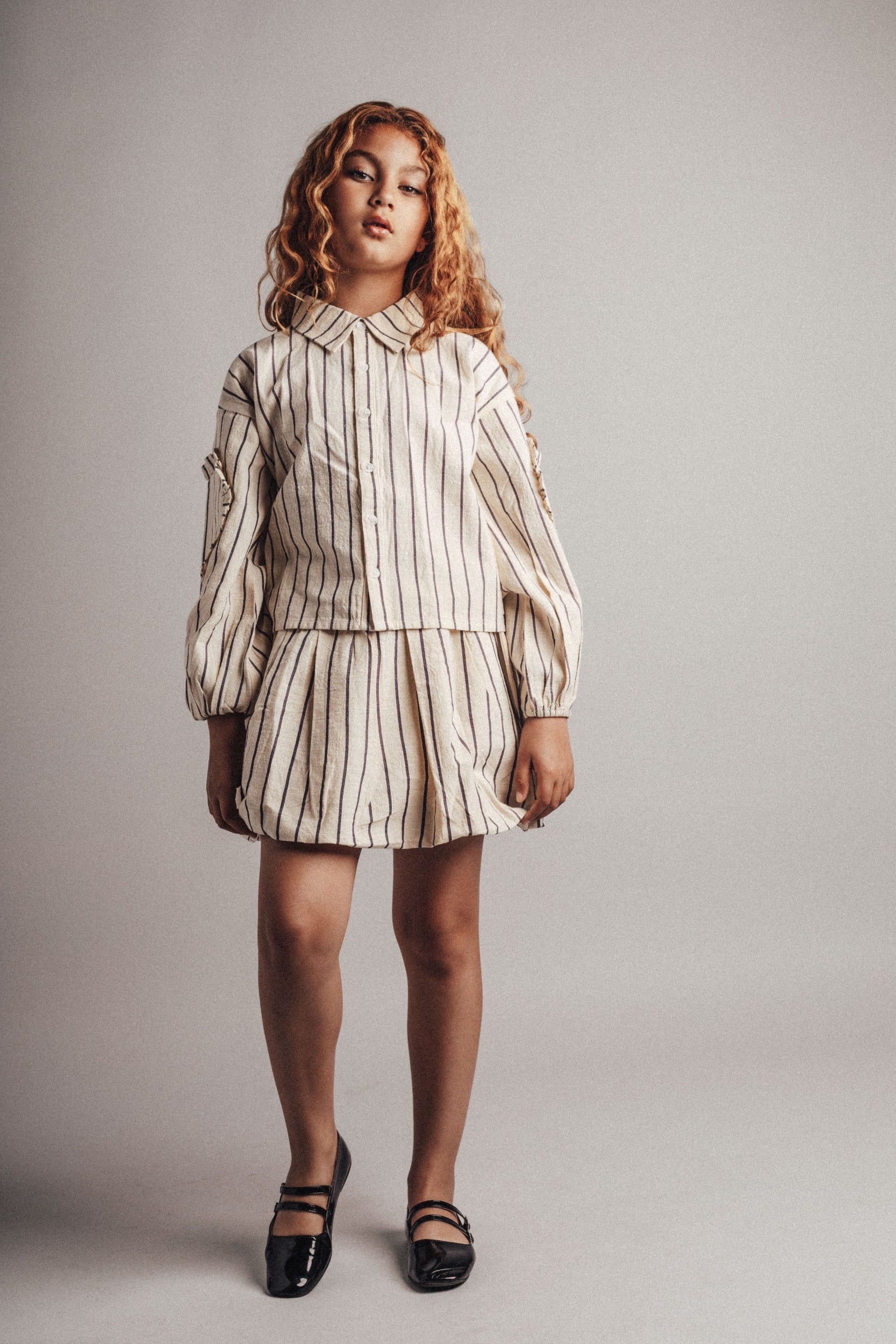 Leuk gestreept ballon rokje van Labo de Colores. Rok Lot heeft een verticaal gestreept patroon. De strepen zijn lavender van kleur, en valt als een paarsblauwe tint. De ondergrond van ballon rok Lot is een grijzige toon.