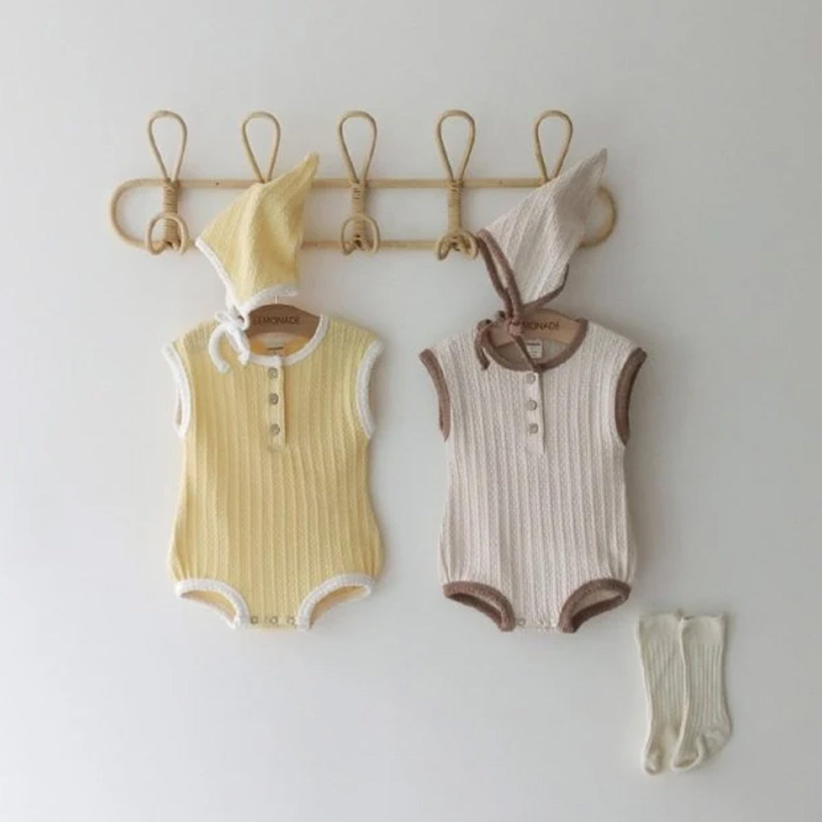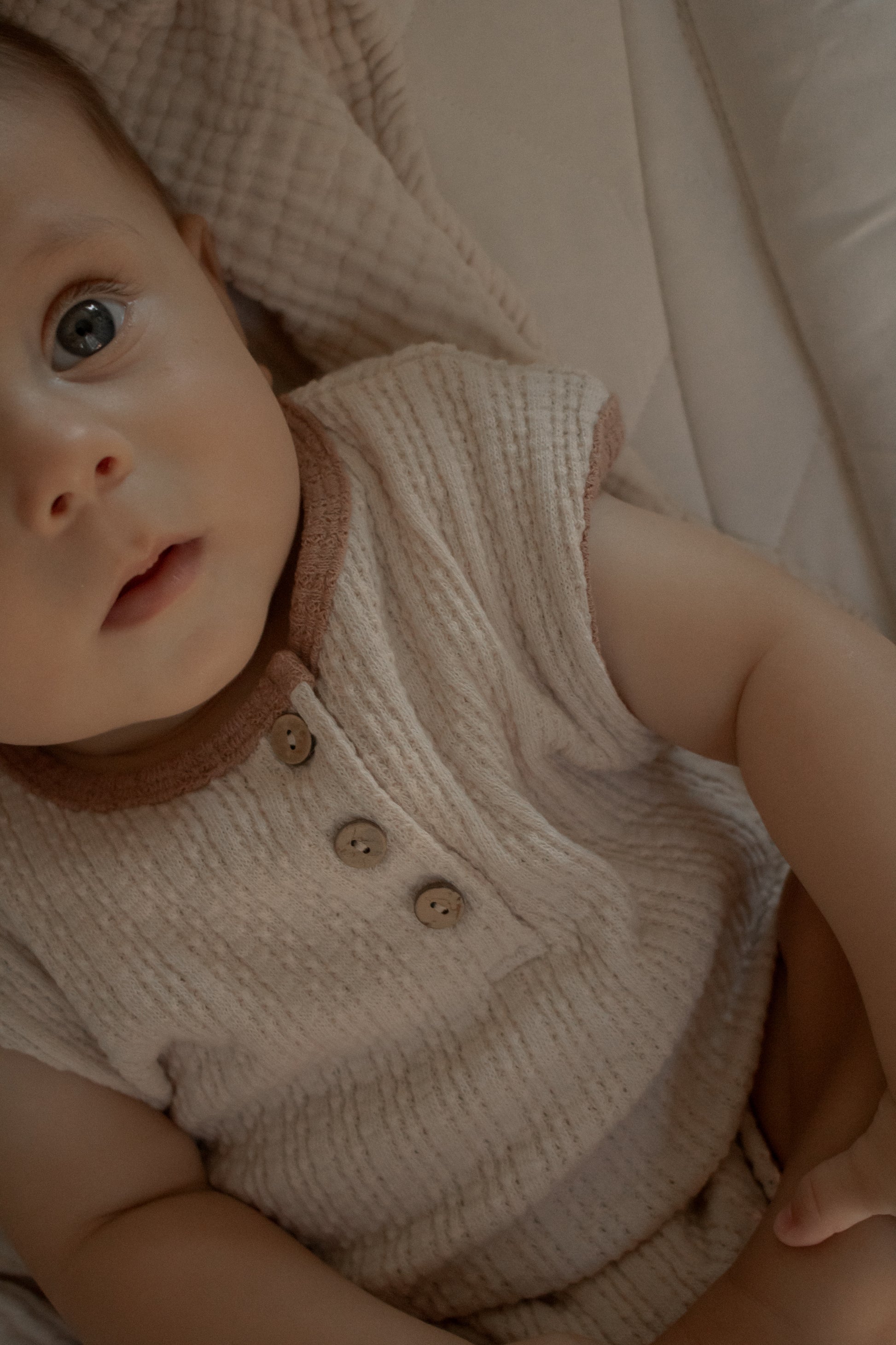 Mouwloos rompertje voor de zomer. Gemaakt van mooie beige rib stof met bruine boorden bij de hals, armopening en beenopening. De bruine knoopjes zorgen voor een prachtig geheel.