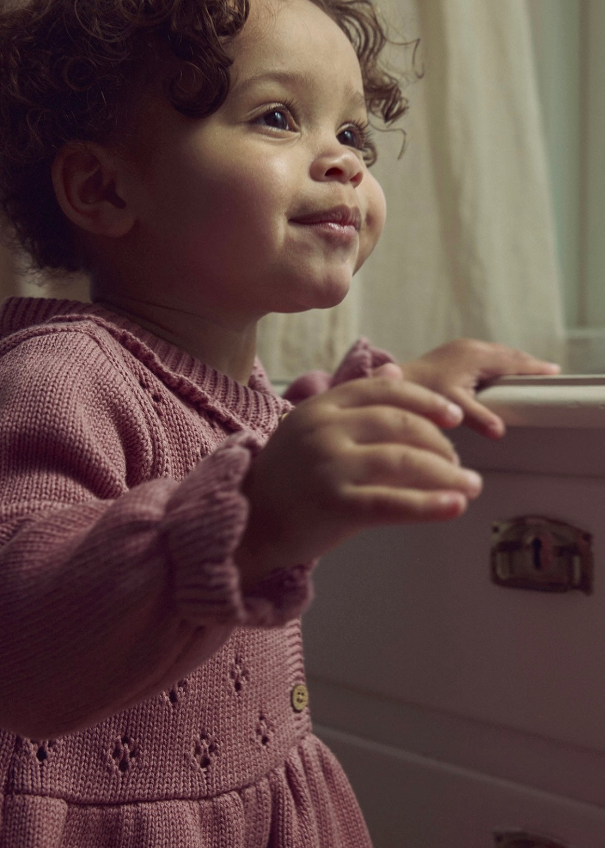 Prachtig gebreide winter jurk voor baby's en dreumessen van Lil'Atelier. De kleur nostalgia rose is een oudroze/mauve tint. Het breiwerk van jurk Lia kenmerkt zich door opengewerkte design en zachtheid voor een comfortabel gevoel.