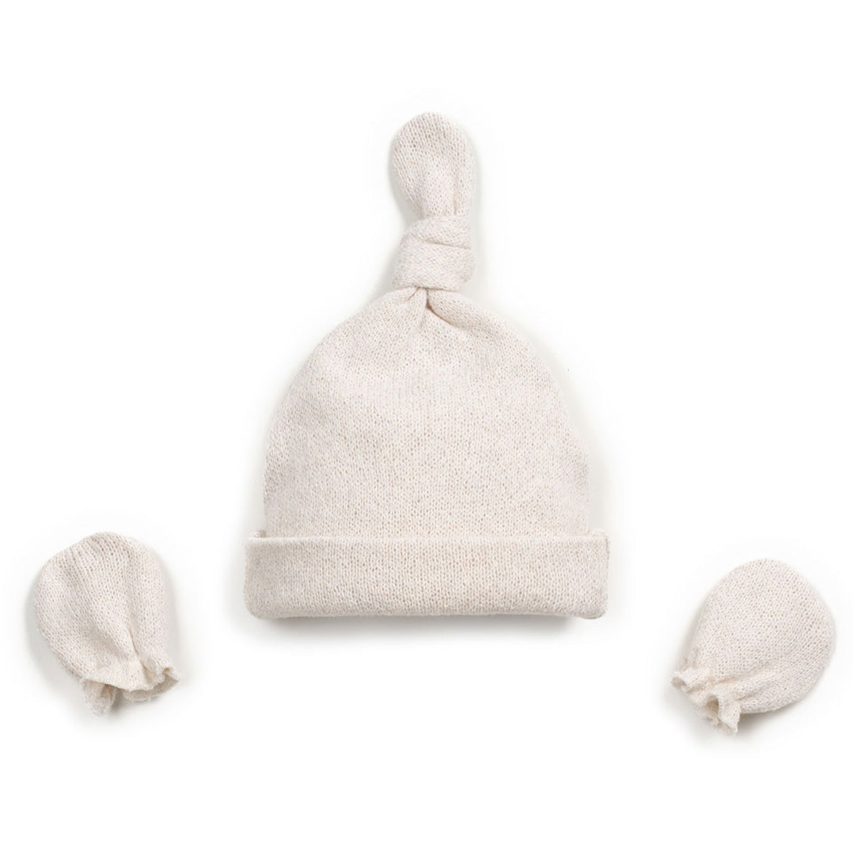 Newborn set van het Portugeese babykleding merk Play Up. Het set bestaat uit een geknoopt mutsje en wanten. De anti krab handschoenen hebben elastische boorden. De naturel offwhite tint maakt dit een unisex set, geschikt voor zowel jongen als meisje. Leuk om te geven als zwangerschapsaankondiging cadeau of als kraamcadeautje.
