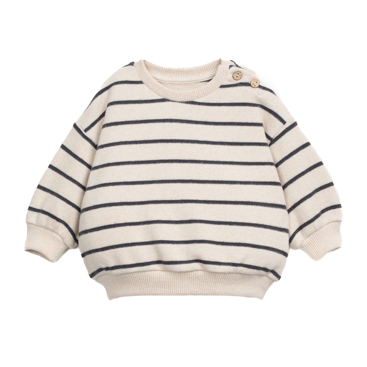 Gestreepte sweater voor jongens. Deze sweater van Play Up heeft een ecru kleur met donkergrijs streep patroon. Twee houten knoopjes bij de schouder. Beschikbaar in diverse maten. Voor baby's vanaf 3 maanden tot peuters van 3 jaar.