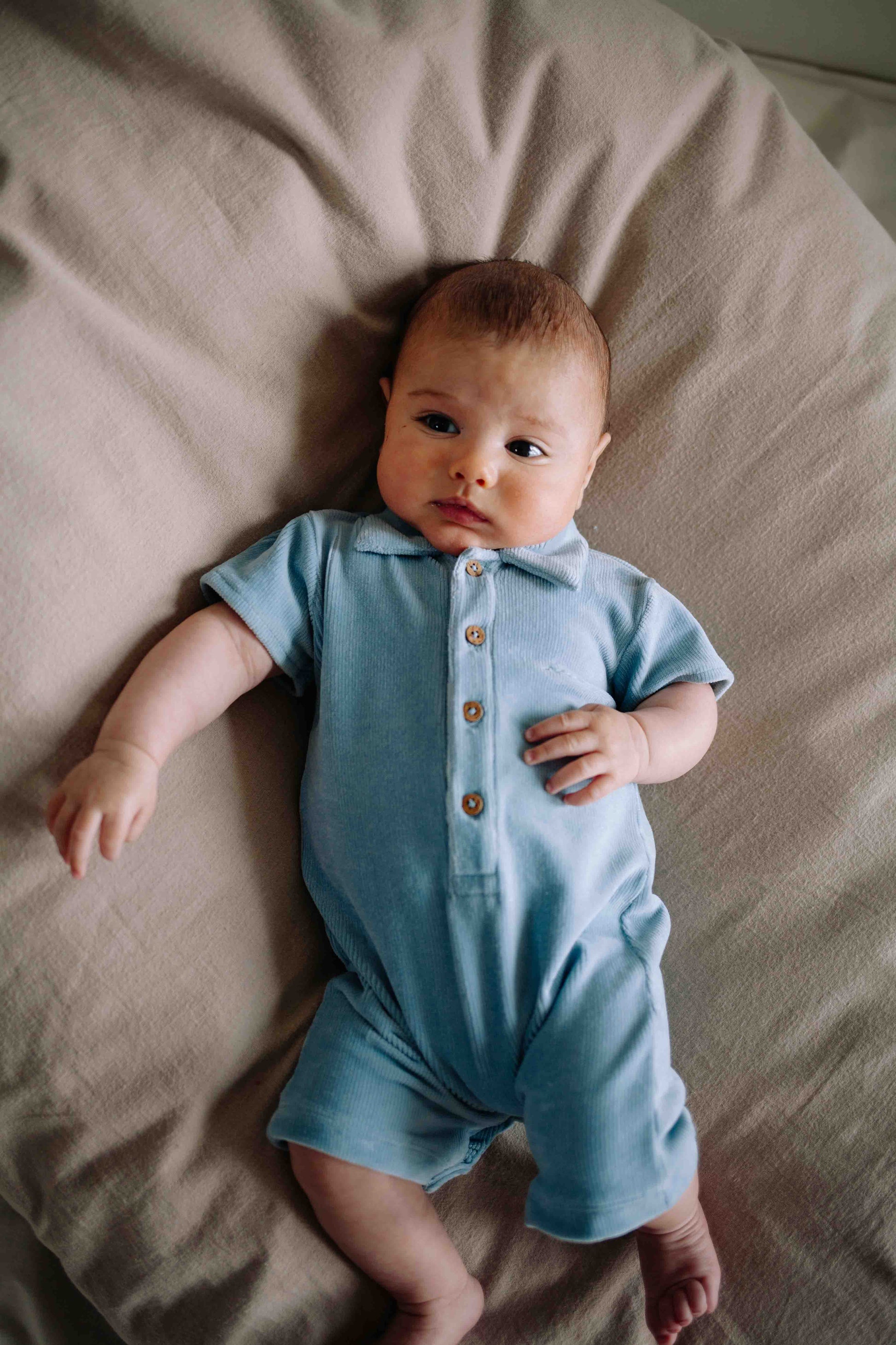Zomers suit met korte mouwen en broekspijpen voor jongens. Suit Gilian van Riffle Amsterdam is gemaakt van blauwe corduroy stof.