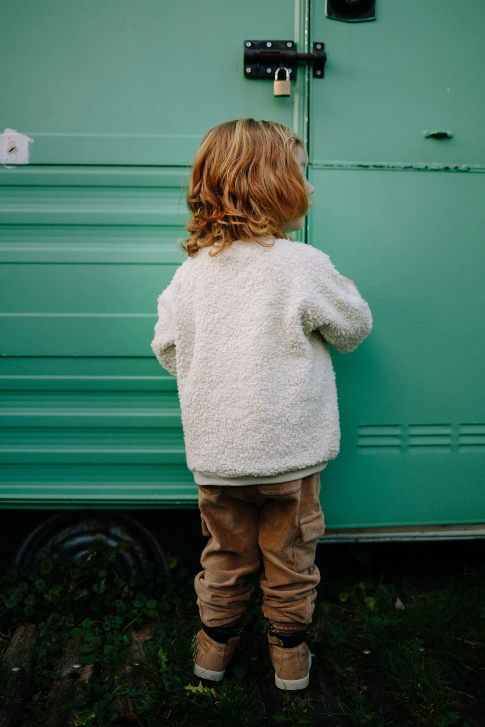 Prachtige teddy sweater van Riffle Amsterdam. Zowel door jongens als door meisjes te dragen. Twee zakjes aan de voorzijde (alleen bij de grotere maten). De kleur is offwhite/creme, de stof is niet volledig effen qua kleur en heeft her en der wat donkere spikkeltjes. Dit valt met dragen niet op.