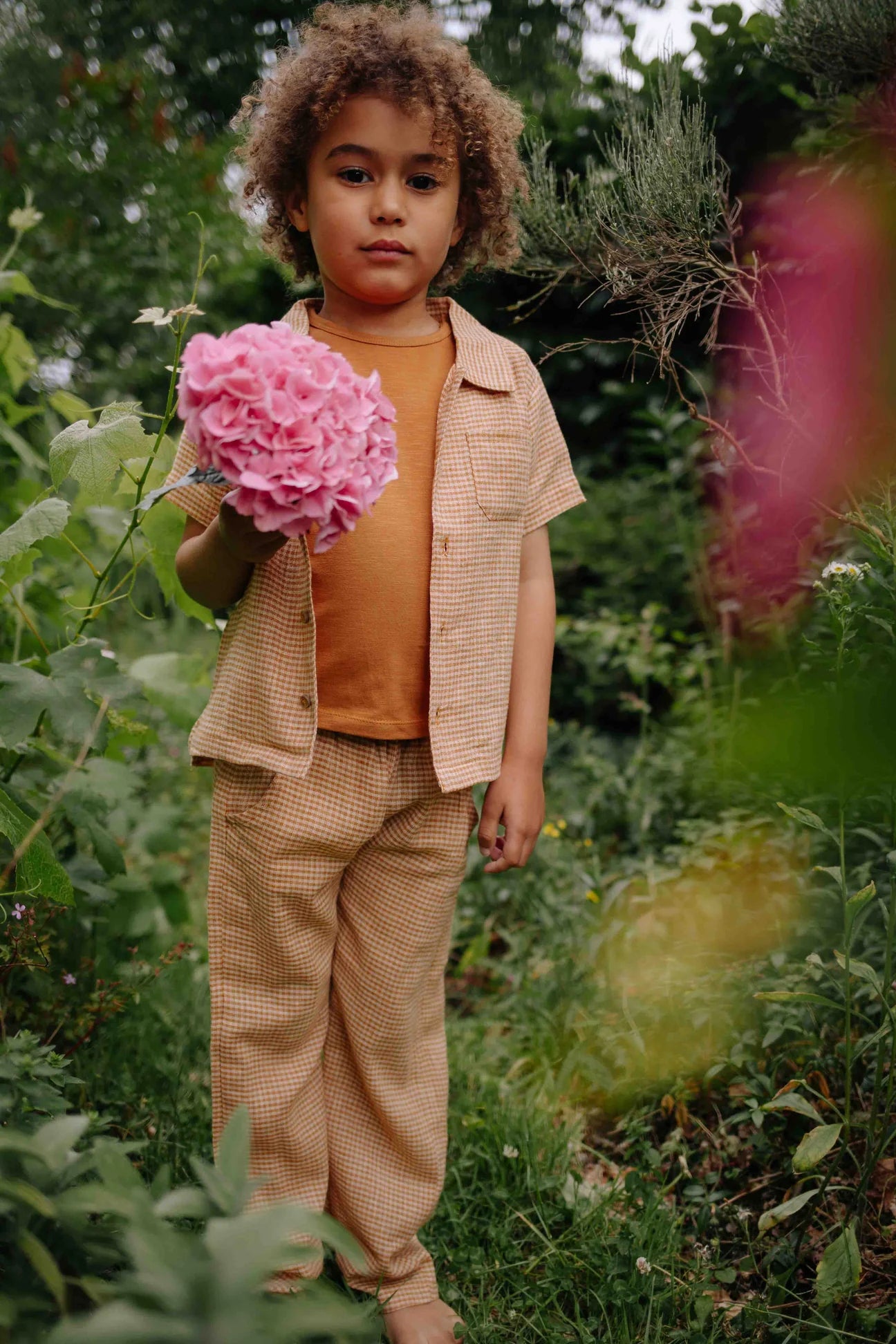 Prachtig geruit zomer broekje voor baby's, peuters en kinderen. De geweven katoen linnen broek is voor zowel jongens als meisjes. De ruitjes hebben de kleur camel bruin.