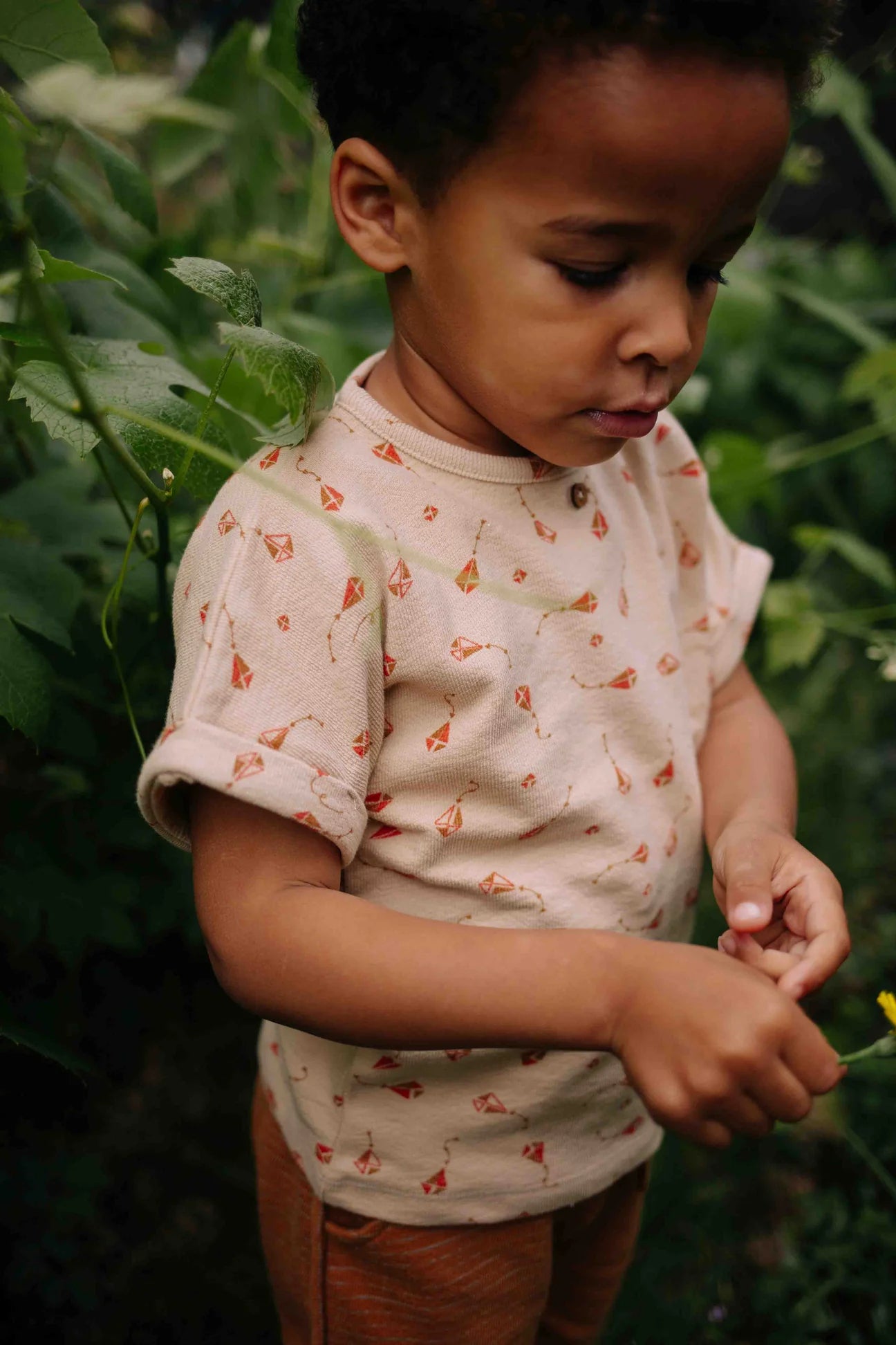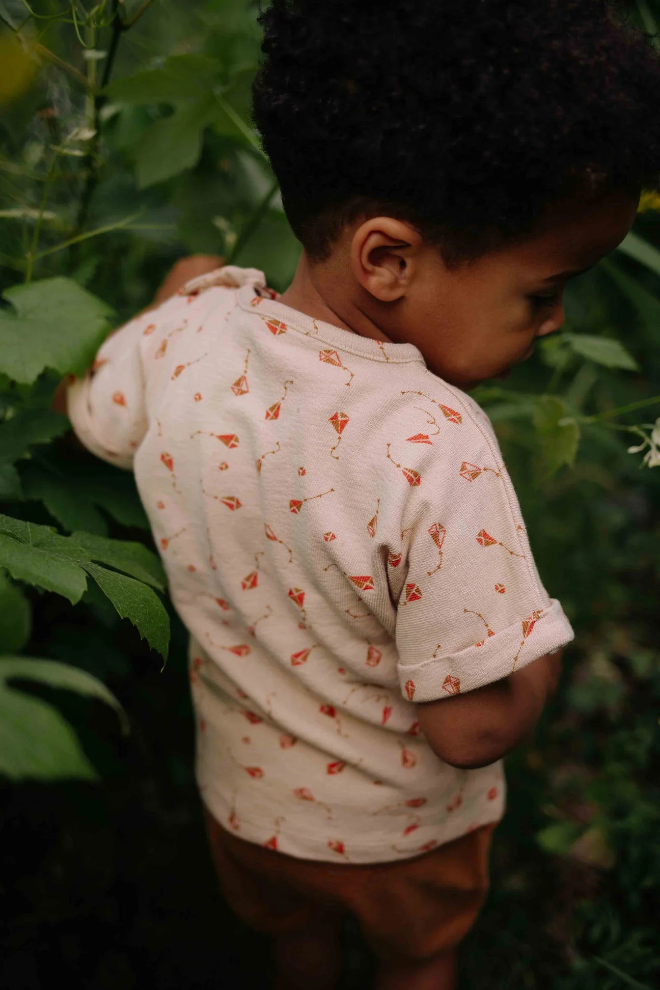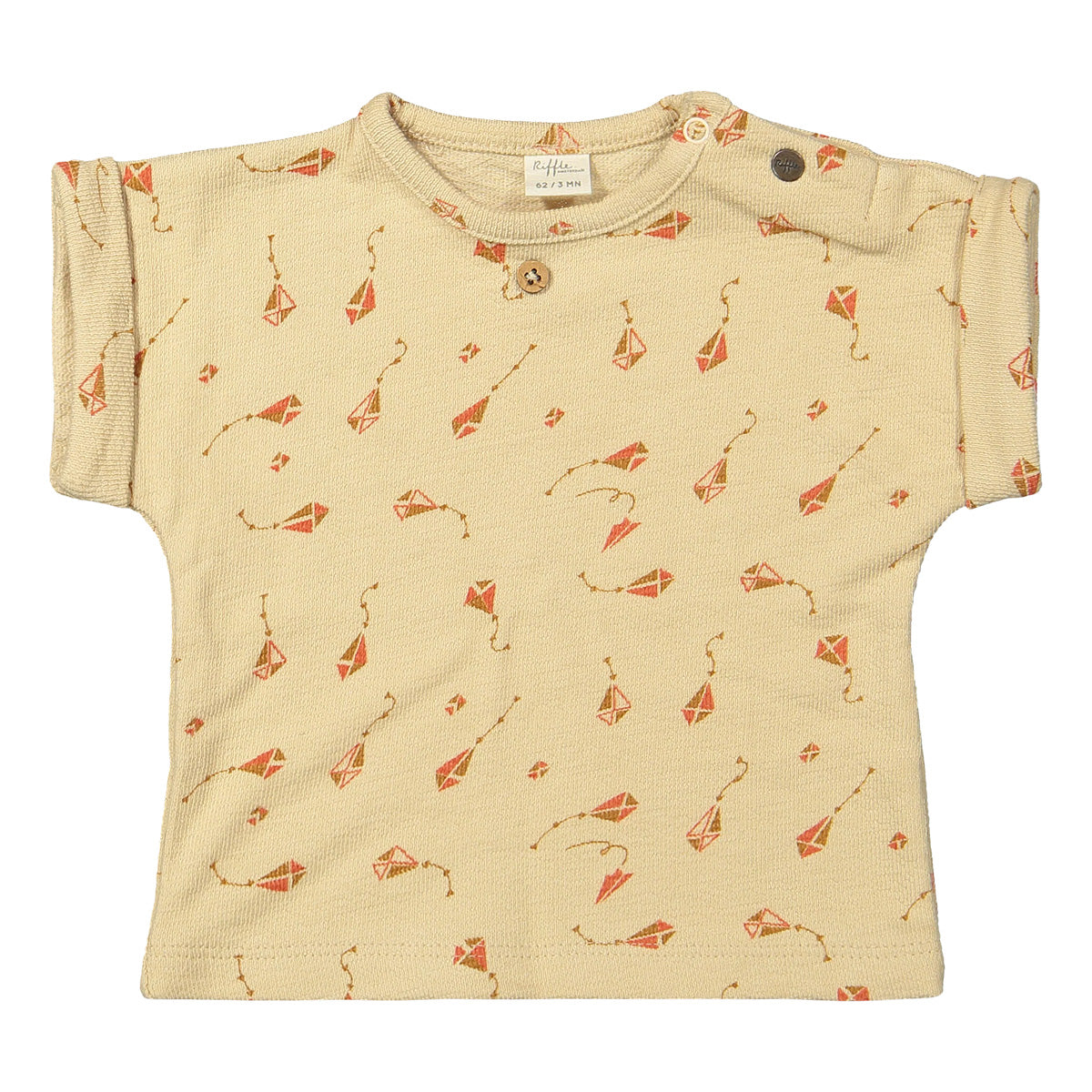 Tof shirt voor baby jongens of unisex. T-shirt Juul van Riffle Amsterdam heeft een all-over print met vliegers. De kleur van het shirt is beige, en de vliegers hebben rood/oranje/bruin tinten.