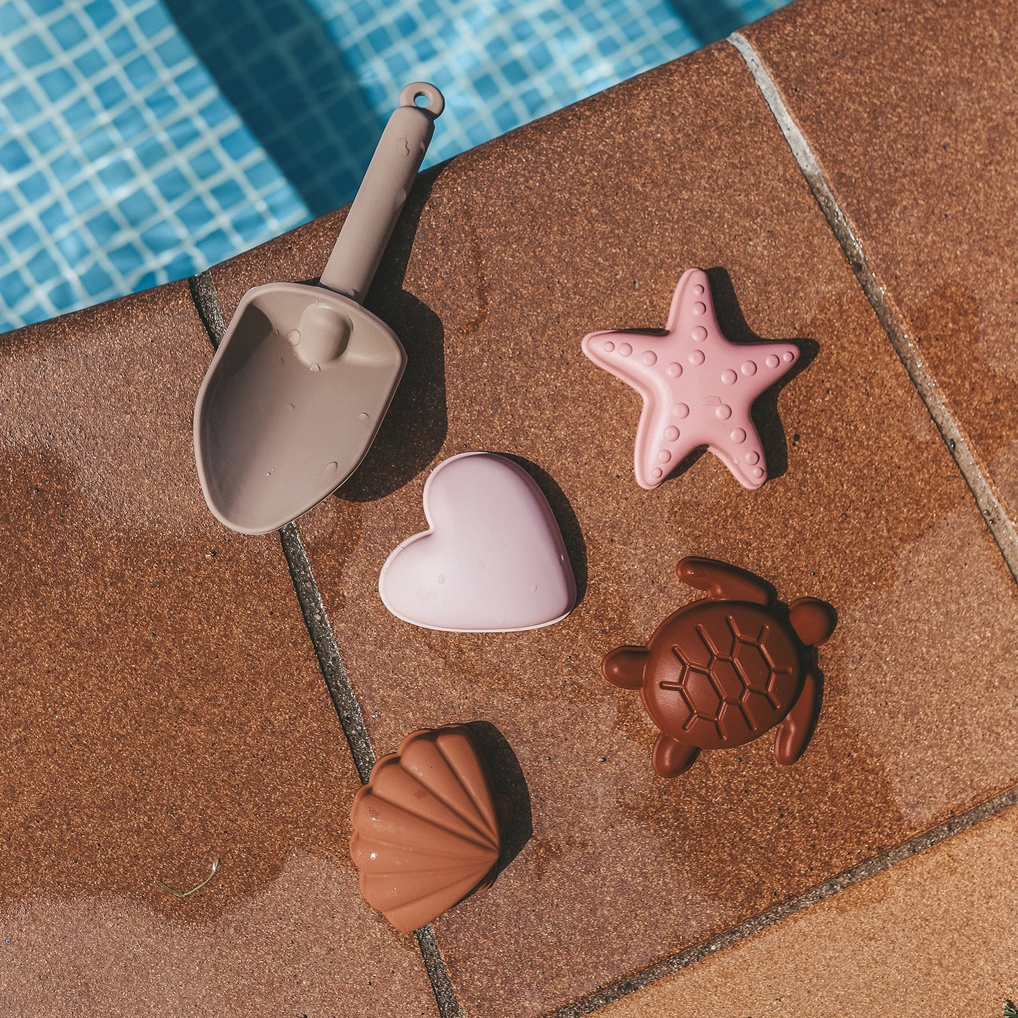 Beach set Sari van Salted Stories is onmisbaar voor een dagje strand, voor op vakantie of gewoon voor in je eigen tuin. Dit set bestaat uit een emmer met schepje en vijf vormpjes om zandfiguurtjes mee te maken: een zeester, een hartje, een schildpad, een schelp en een regenboog met wolkjes. Het volledige set is uitgevoerd in zacht en flexibel siliconen, waardoor alles makkelijk zandvrij gemaakt kan worden en het maakt Sari Beach set minder breekbaar (het blijft ook heel als het in de verdrukking komt).