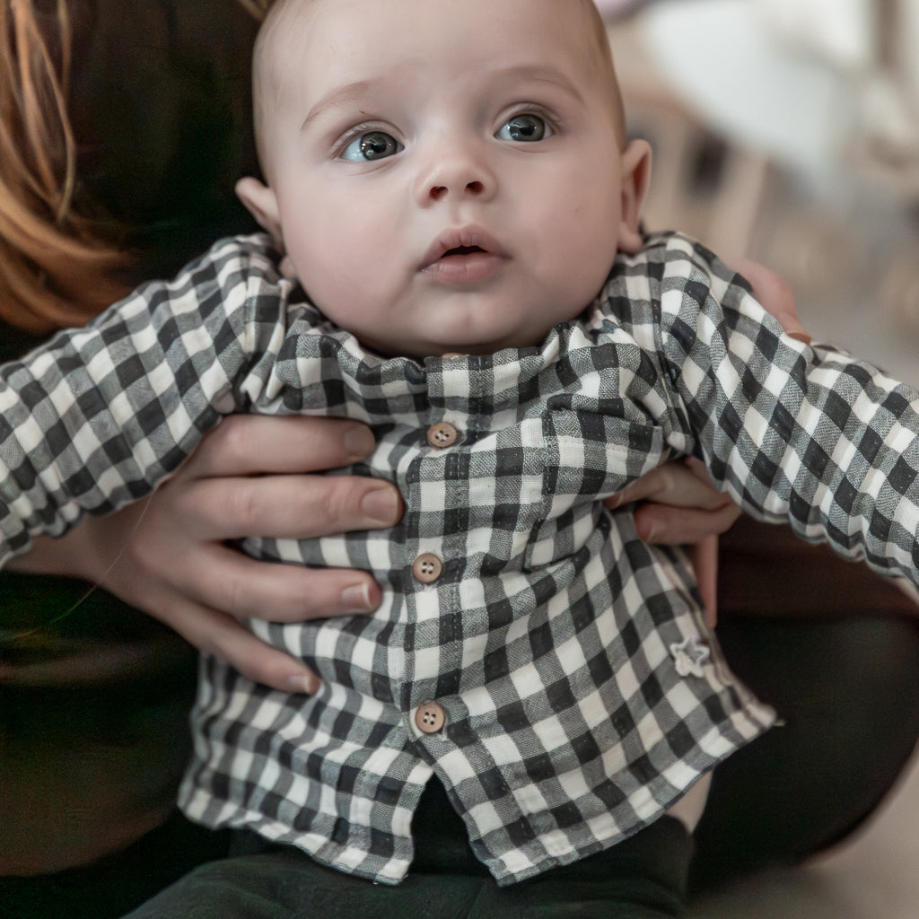 Blouse met lange mouwen in een fijne tijdloze gingham ruit. De gingham blouse sluit middels houten knopen aan de voorzijde en heeft een zakje links. Het gingham patroon is in de kleuren offwhite/donkergrijs