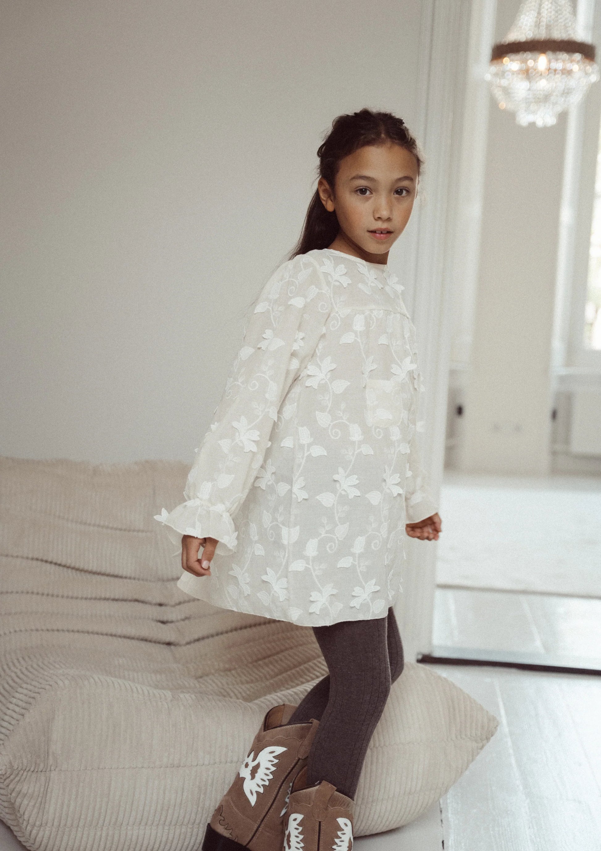 De crème kinderjurk heeft een doorlopende knoopsluiting aan de achterkant.