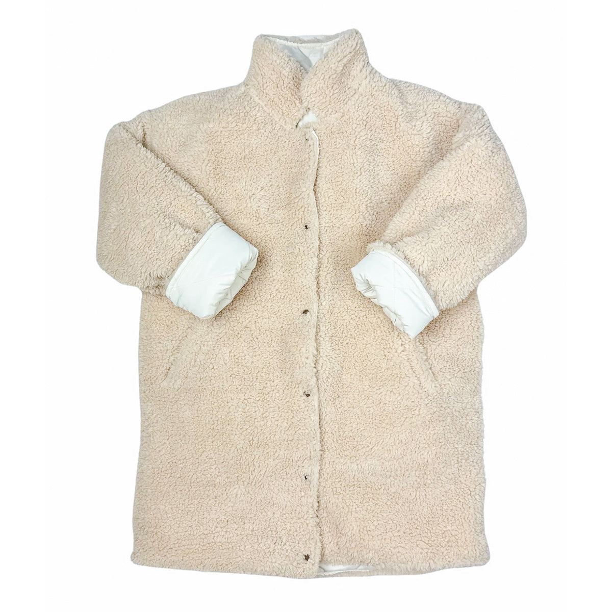 Lange teddy jas voor meisjes. Deze two in one jacket is aan twee kanten te dragen. De ene kant is gewatteerd en de andere kant is van heerlijke zachte teddy. De jas heeft de kleur beach van Two You Label, dit is een koele licht beige tint. De teddy stof is net een paar tintjes warmer qua kleur.
