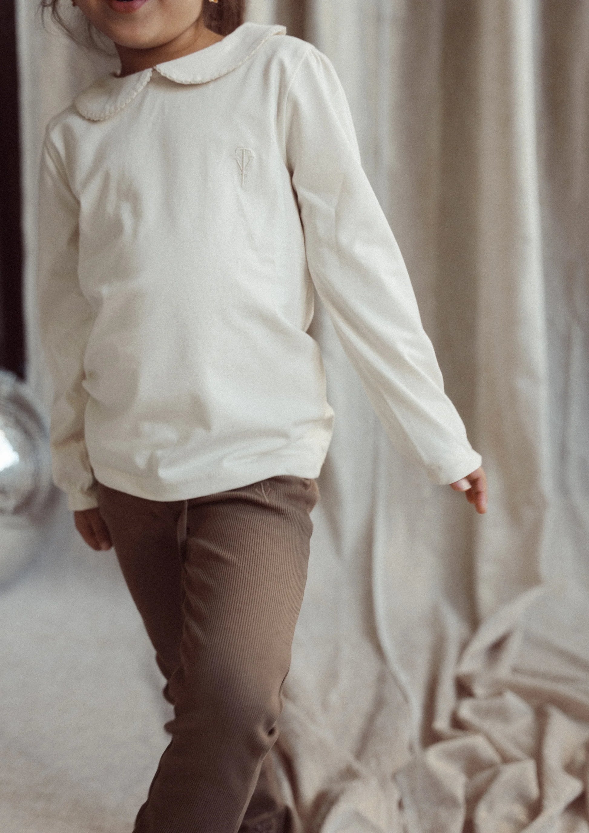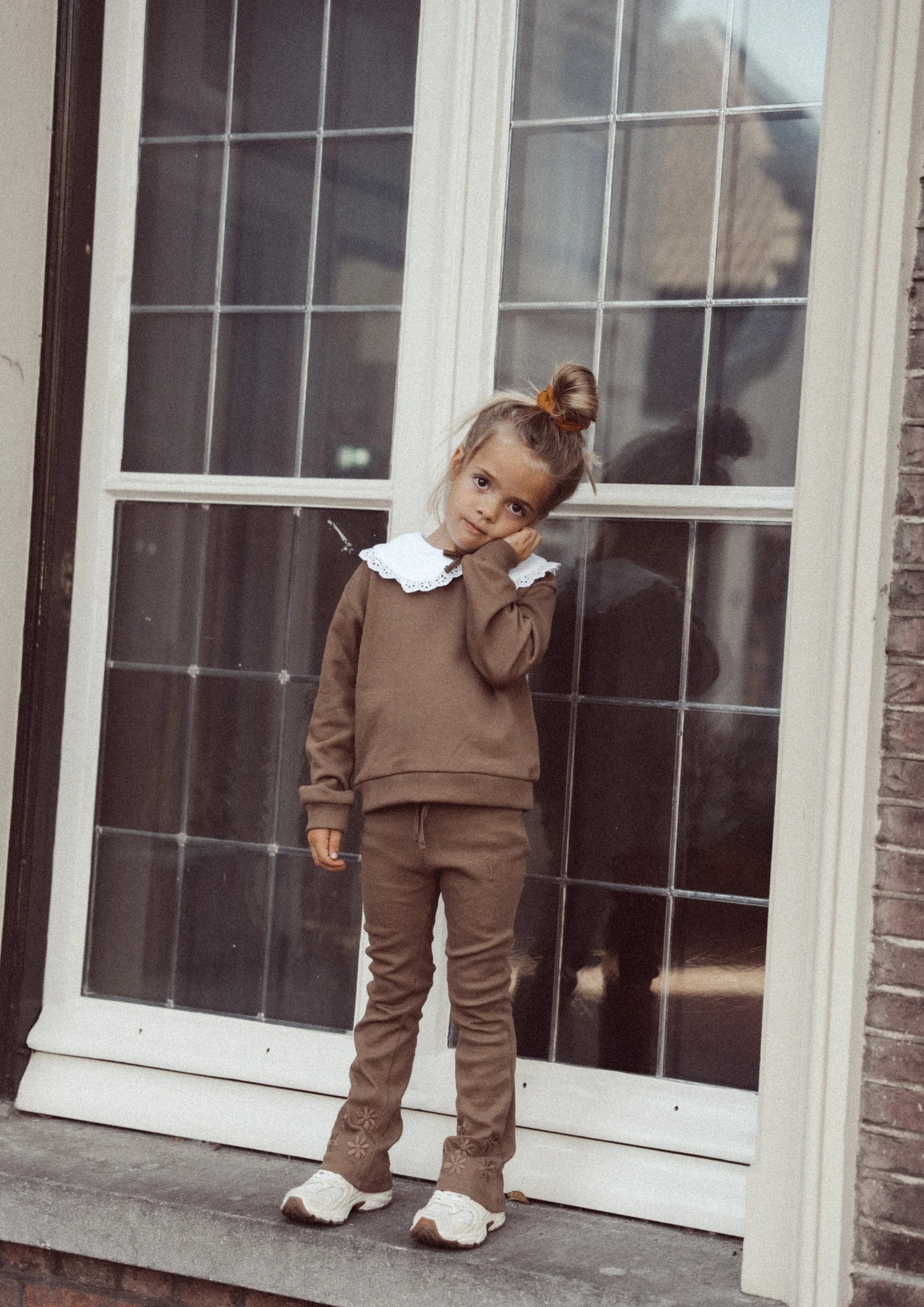 Prachtige flared legging van Two You Label. Legging Lilly straight heeft aan de onderkant geborduurde bloemen, van dezelfde kleur garen als de stof. De stof heeft een subtiele rib. De kleur is midden bruin. Deze flare kinderbroek voor meiden is het hele jaar door te dragen.