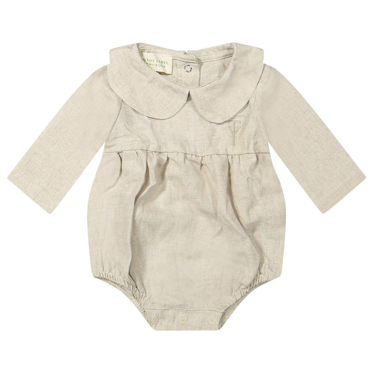 Katoen linnen baby romper voor meisjes uit de Tiny Two You babykleding collectie van Two You Label. Suit Linny heeft een schattig kraagje en een speelse look door het geplooide model. De kleur beach is een lichtbeige tint. Dit rompertje is het heel jaar door te dragen. Zit vrij luchtig dus prima voor de lente en de zomer. In de herfst en winter kan je het combineren door een vestje eroverheen te dragen en kniekousen/maillot eronder.