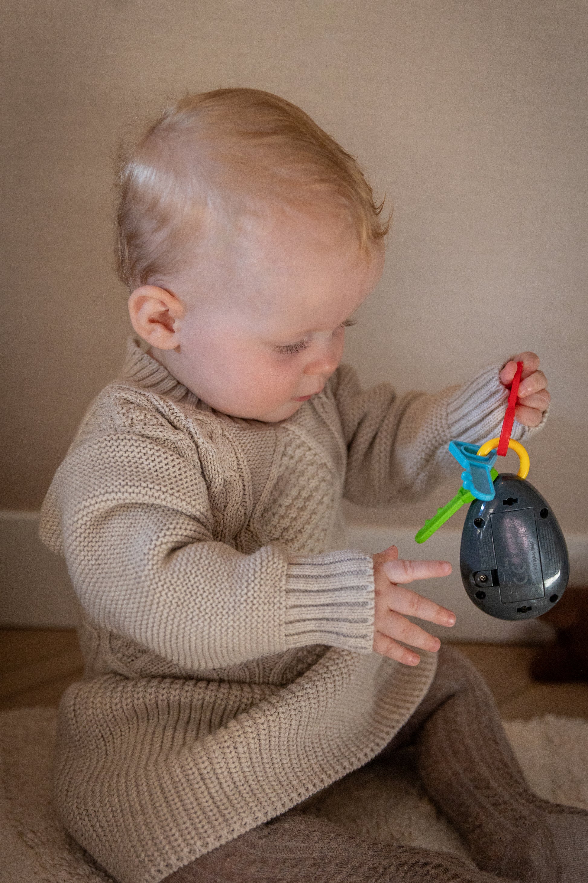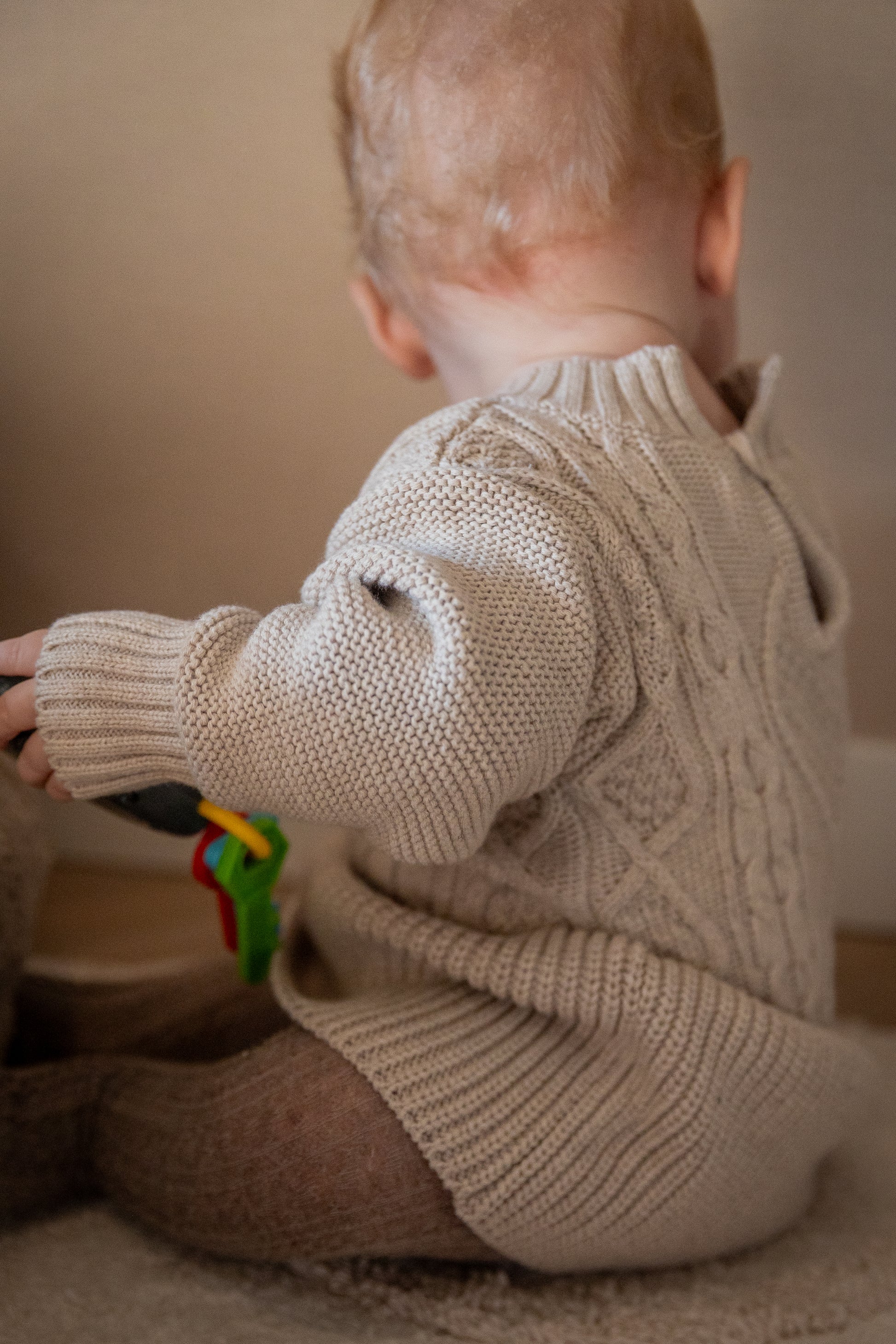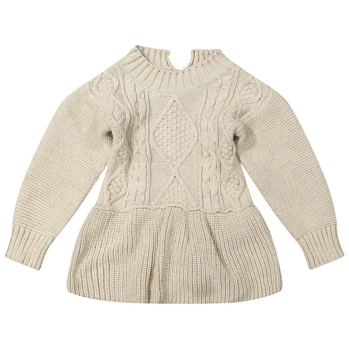 Gebreide baby jurk uit de Tiny Two You collectie van Two You Label. Jurk Kate heeft een kabel patroon op het voorpand en is verder rib gebreid. De winterjurk voor baby's heeft een vastzittende romper broekje onder de jurk. Dit zorgt voor een net afgewerkt geheel en comfort voor je kleine meisje. De kleur oat is een vergrijsde beige tint.