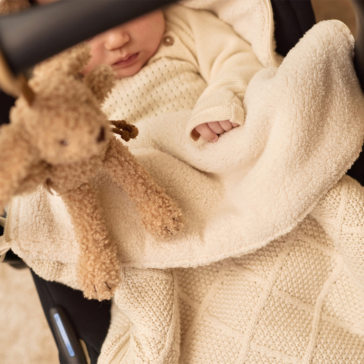 Een voetenzak is echt een uitkomst. Je baby leg je gemakkelijk in de voetenzak door de zak eerst helemaal open te ritsen, eruit gaat net zo makkelijk. Kortom: een super handige essential voor het vervoeren van je baby. De voetenzak is voorzien van openingen in de achterkant om het vastmaken van de gordels extra makkelijk te maken. Het is een universele voetenzak voor de Maxi Cosi en elk ander merk categorie 0 autostoeltje met drie of vijfpuntsgordel. Je kunt deze comfortbag ook in de kinderwagen gebruiken. Zo is je baby in een mum warm ingepakt voor de wandeling. De prachtige Check Knit print met gebreid ruitpatroon hebben we in de kleuren Biscuit en Oatmeal.