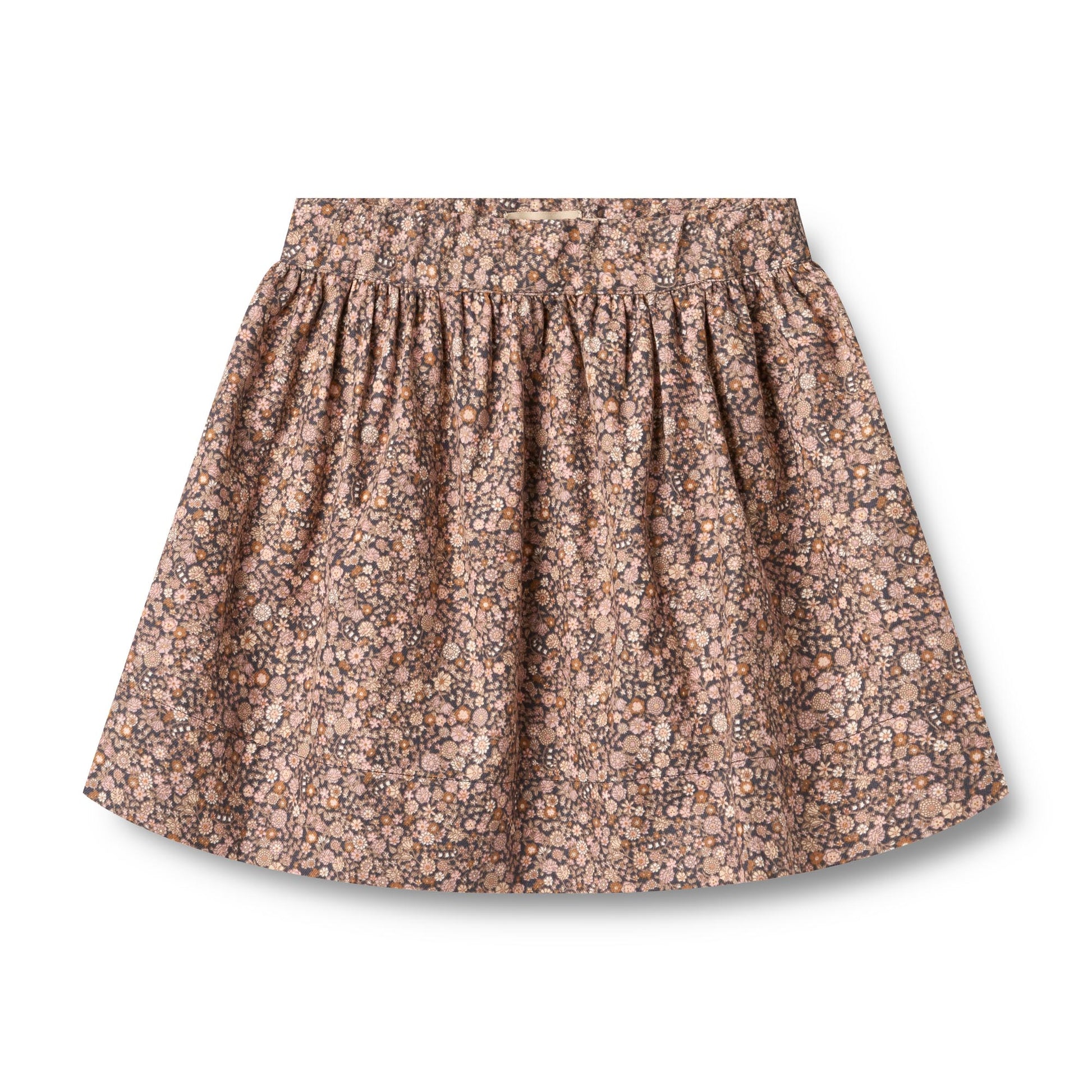 Gebloemd rokje van het Deense kinderkleding merk Wheat. Rok Sissi heeft een winters bloemen design: black sea garden. De hoofd kleuren zijn donkergrijs, lichtroze en oranje en beige.